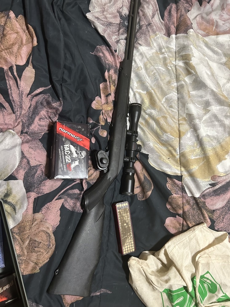 22 marlin rifle with scope, gun lock, and two boxes of bullets