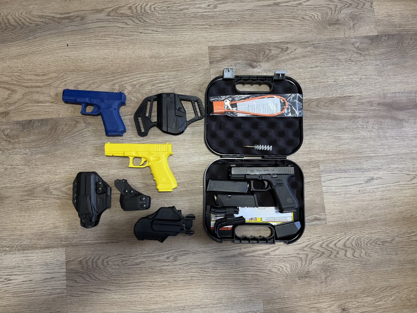 Gen 5 Glock 19 with AmeriGlo night sights. Comes with original box, three mags, Blackhawk Stache Premium kit (IWB/AIWB), Blackhawk T-Series L2C, and Uncle Mike’s Apparation OWB holster (it actually conceals a lot better than I thought). An added bonus is I’m throwing in a Glock 17 Yellow Gun, Glock 19 Blue gun, so you can practice your draw and holster safely. Recently cleaned and checked by a Glock armorer to ensure it’s good to go. Texting is the easiest way to get in touch with me.