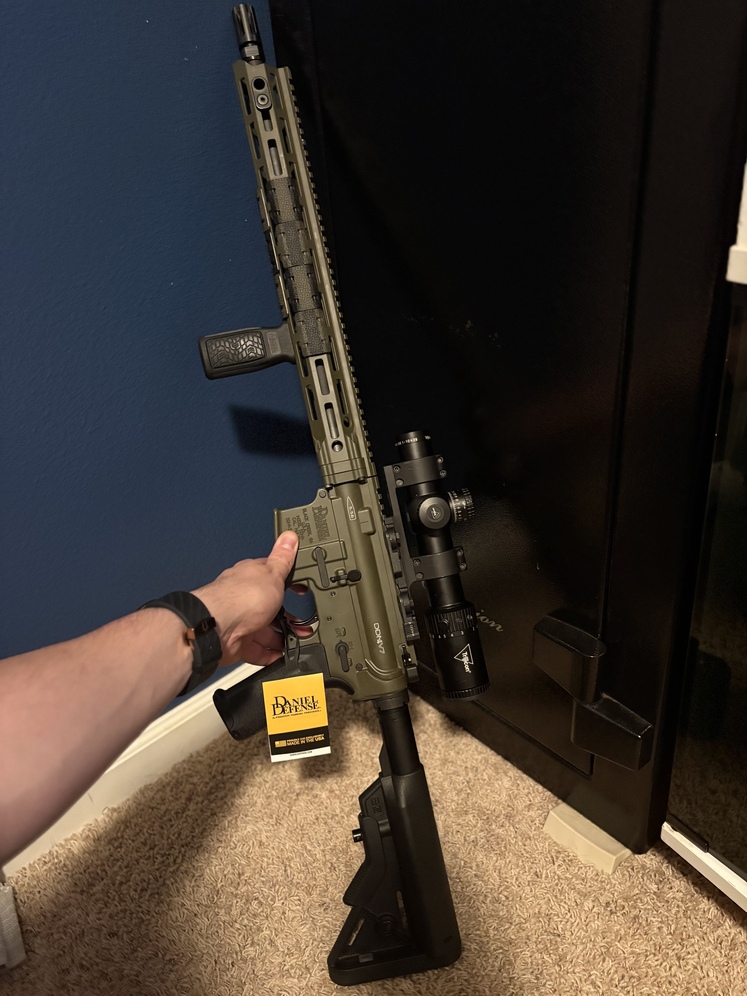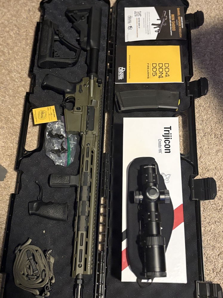 Up for sale is a Daniel Defense M4V7 in OD green with high quality extras. On top of the stock rifle this sale includes a Trijicon Credo HX 1-10 on a Larue QD mount, a Geissele SSA-E trigger, a Magpul adjustable gen 2 sling, and a B5 SOPMOD stock, and a BCM gunfighters pistol grip. This package comes with everything you need for a top tier general purpose rifle. I will be willing to reduce the price by 1450 if you aren’t interested in the optic and mount, and 220 if you aren’t interested in the trigger upgrade. Which brings the base rifle package to 1530. There is well over $4100 invested in this rifle as it sits. Will entertain partial trades but I’m mainly interested in cash. Will only sell to AK residents or Active Duty Military on orders who can legally own and possess this firearm.