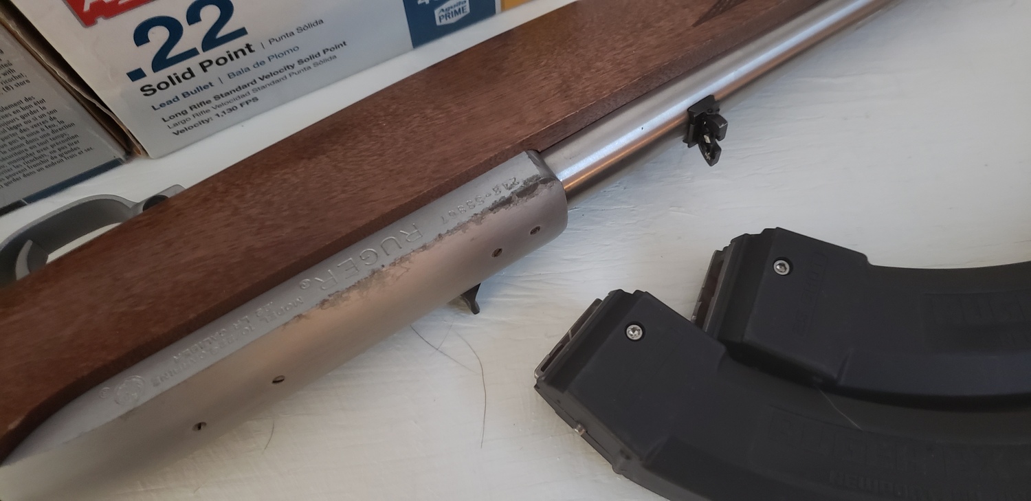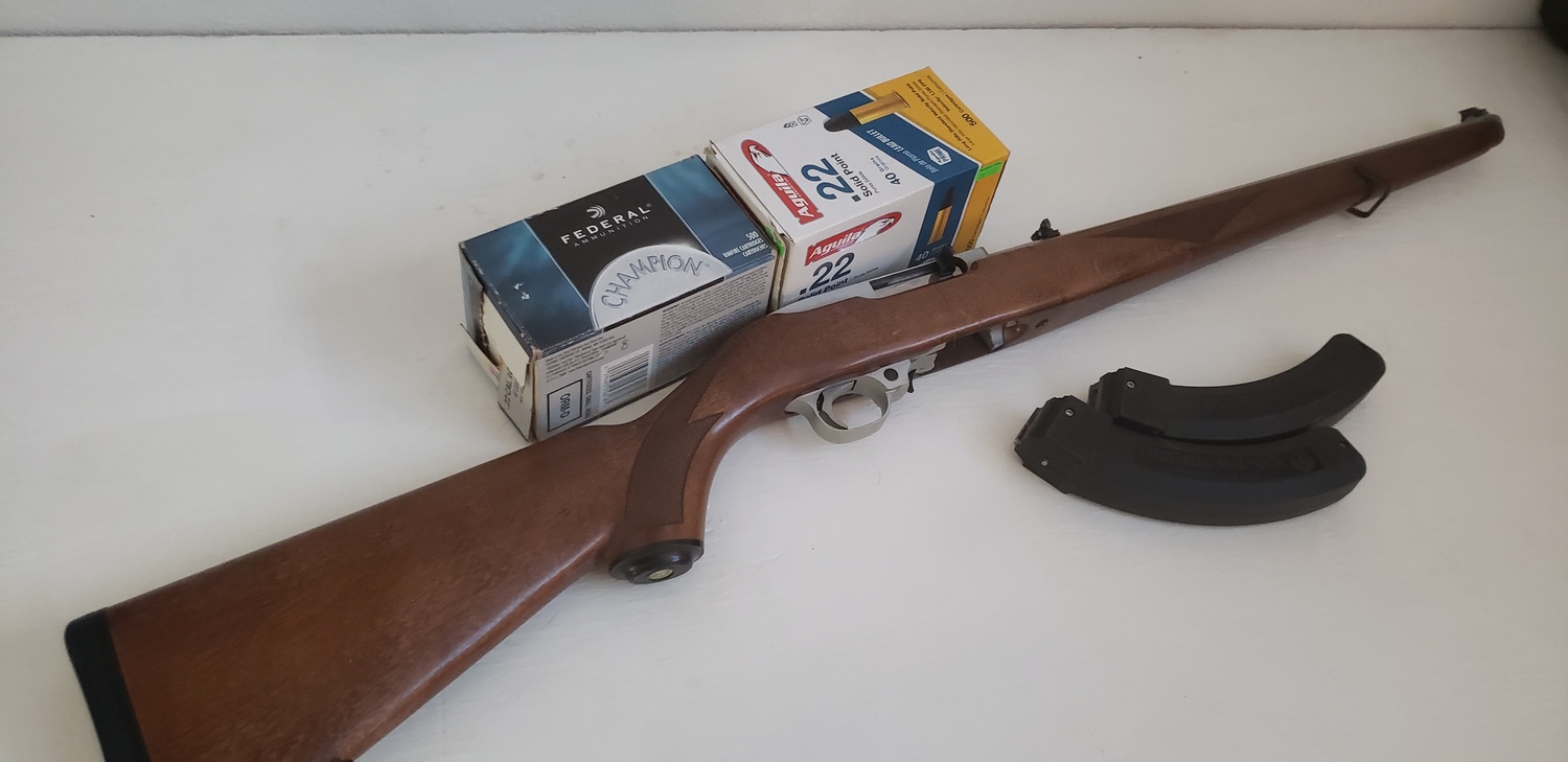 Ruger 10/22 .22LR with the full length mannlicher wood stock, 2 bx25 magazines, a tan polymer pistol grip style stock and a couple boxes of ammo. Asking 400$ obo, reciever has some wear doesn't affect shooting.
