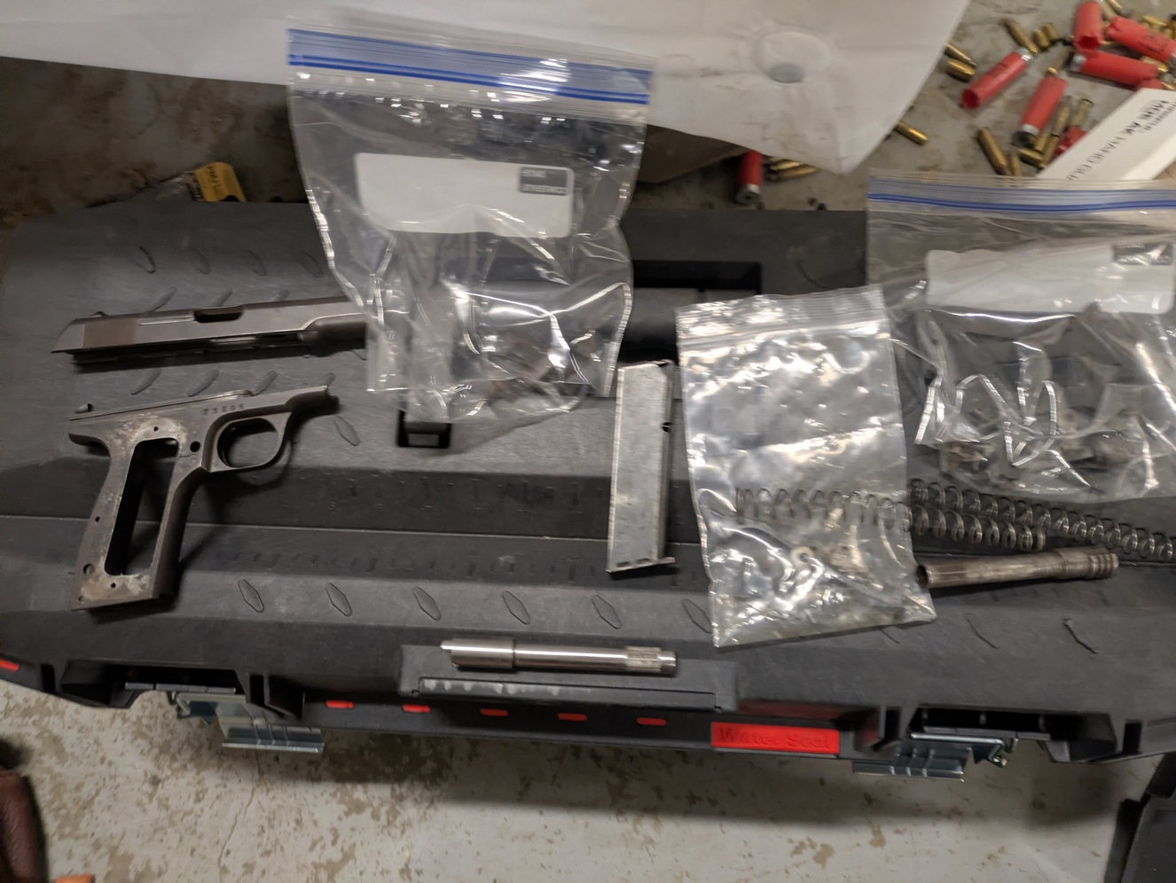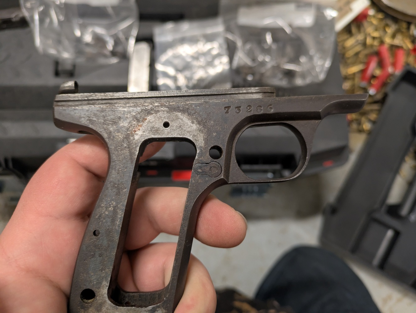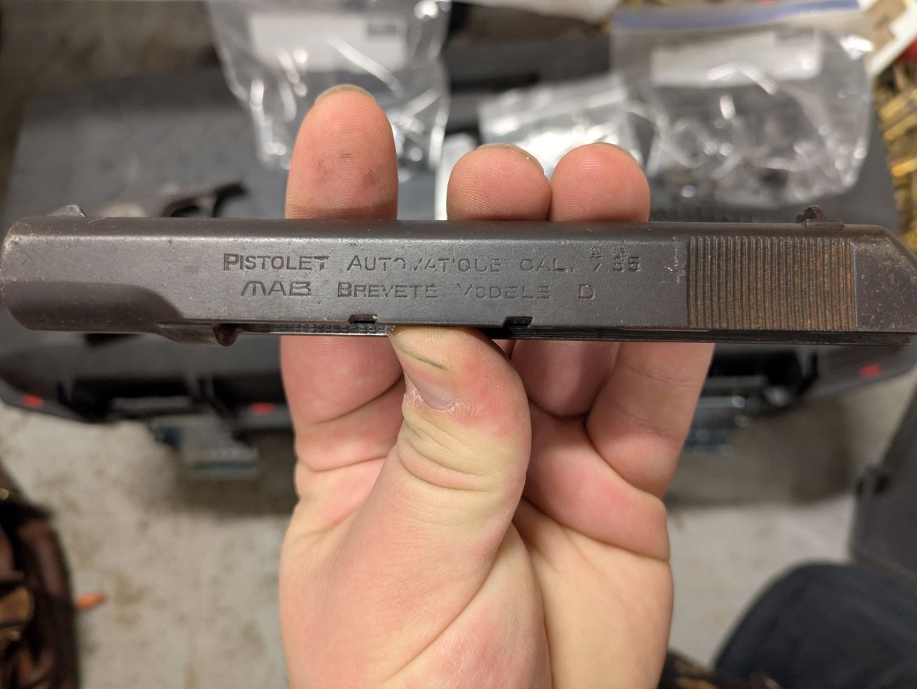 Selling a variety of parts for a French MAB Model D handgun chambered in 7.65 Browning/32 ACP. Some of the parts will need work. Includes a NOS waffen stamped barrel. $100.00