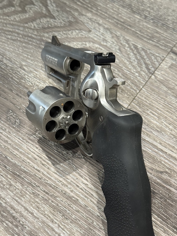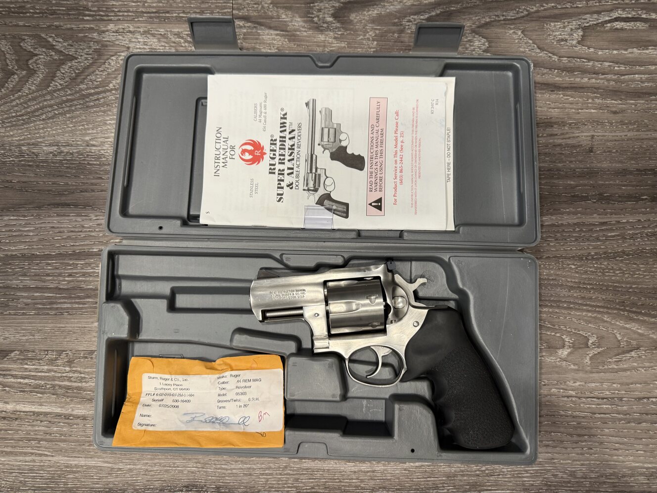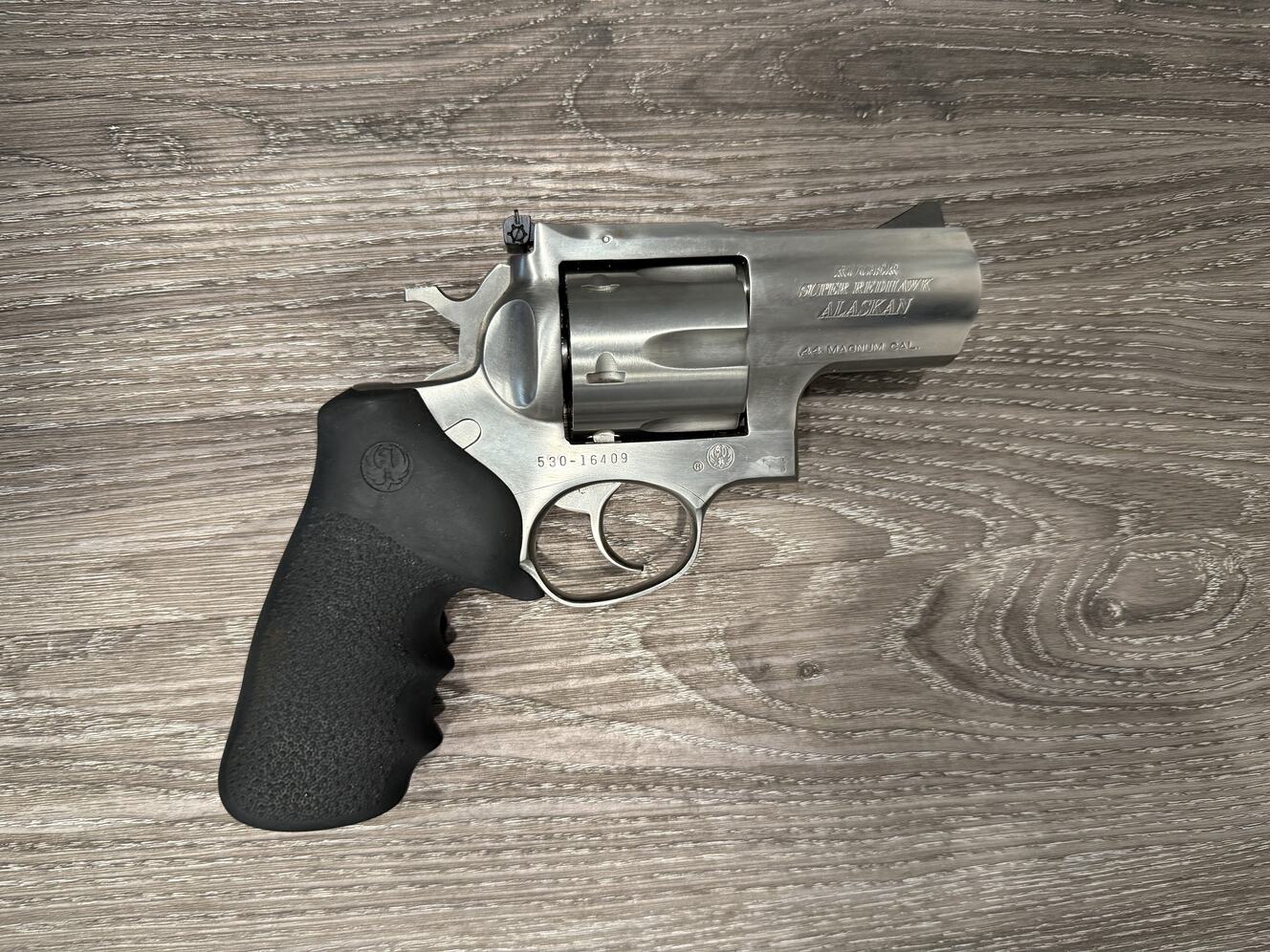 Ruger Super Redhawk Alaskan 44 Magnum 2.5in Stainless Revolver - 6 Rounds - The Super Redhawk Alaskan by Ruger features corrosion-resistant stainless-steel construction with a satin stainless finish. The strong extended frame has extra metal in the top strap, sidewalls, and barrel mounting areas to handle powerful big game loads. The triple-locking cylinder is positively locked into the frame at the front, rear, and bottom for more positive alignment and dependable operation shot after shot.