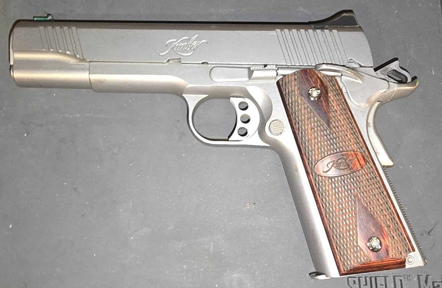 Kimber 1911 10mm Stainless wood grips, like new shape. Comes with box & everything as new. Included is some Underwood ammo & Winchester FMJ. $750. If interested please call or text me at 406-493-7904.