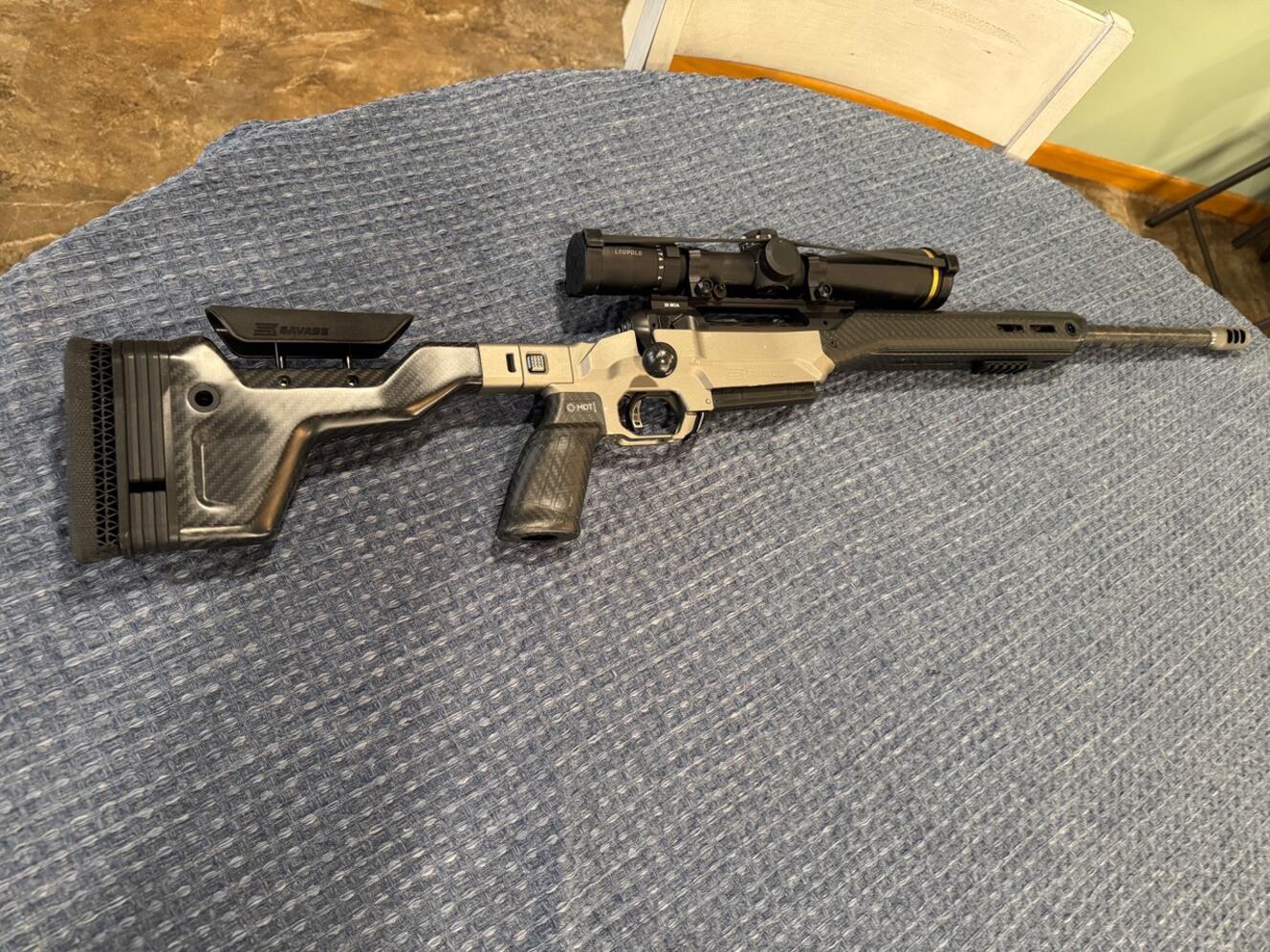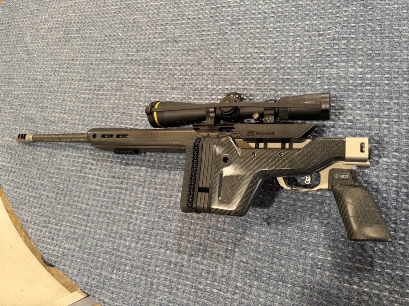 Incredible mountain rifle!! MDT HNT26 folding stock chassis with integrated ARCA rail, 20" Proof Research carbon fiber barrel, Leupold VX-5HD 3-15x44 scope with illuminated dot plex reticle, custom muzzle break, Warne Mountain Tech rings, Backfire Backstop recoil pad, 3" Picatinny M-Lok rail. This thing is loaded and a shooter. Less than 60 rounds fired. Price is firm. Merry Christmas...