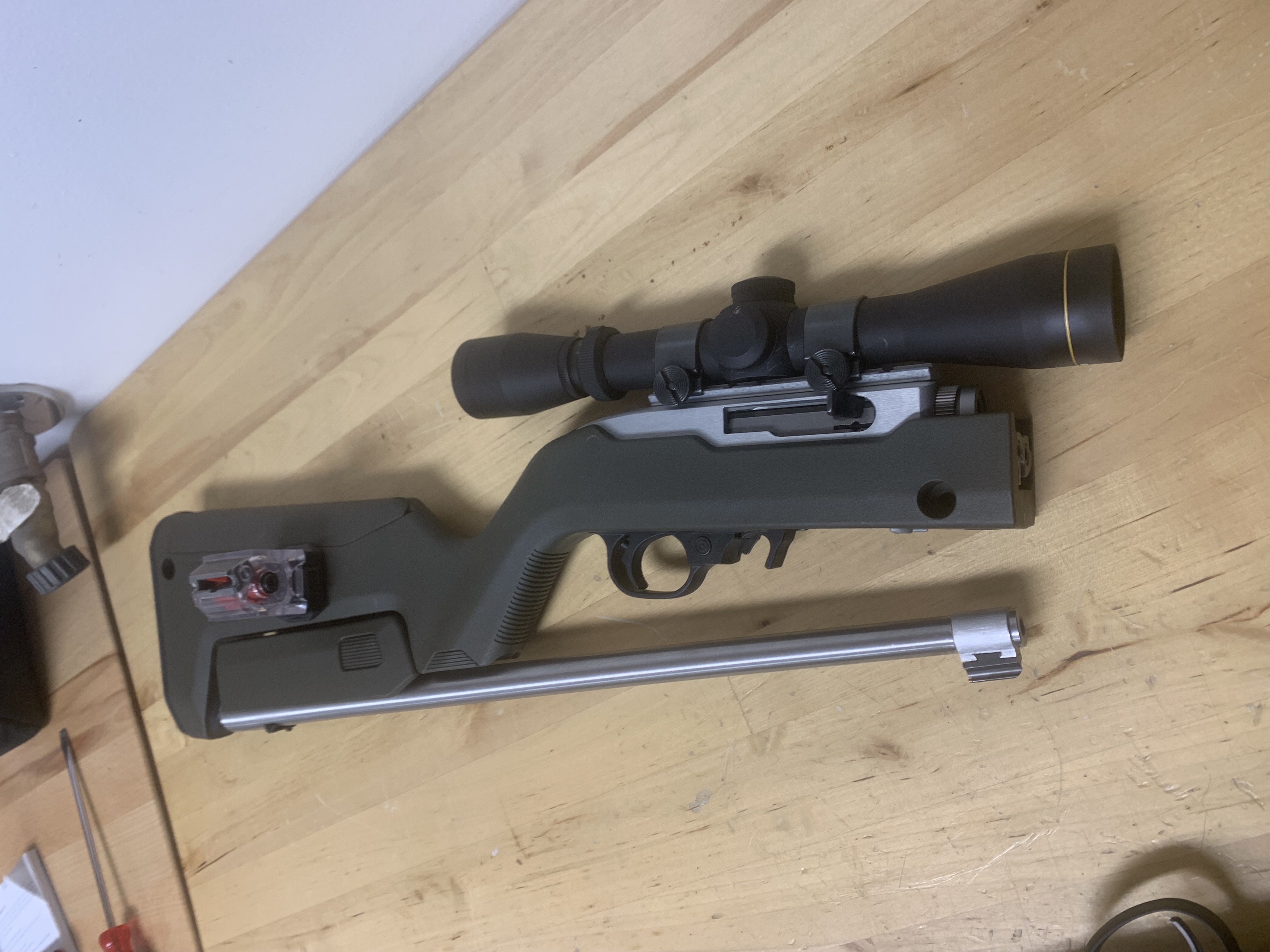 new ruger 10-22 backpack model with luepold 2-7 scope, case, and 1 mag. text with name for response