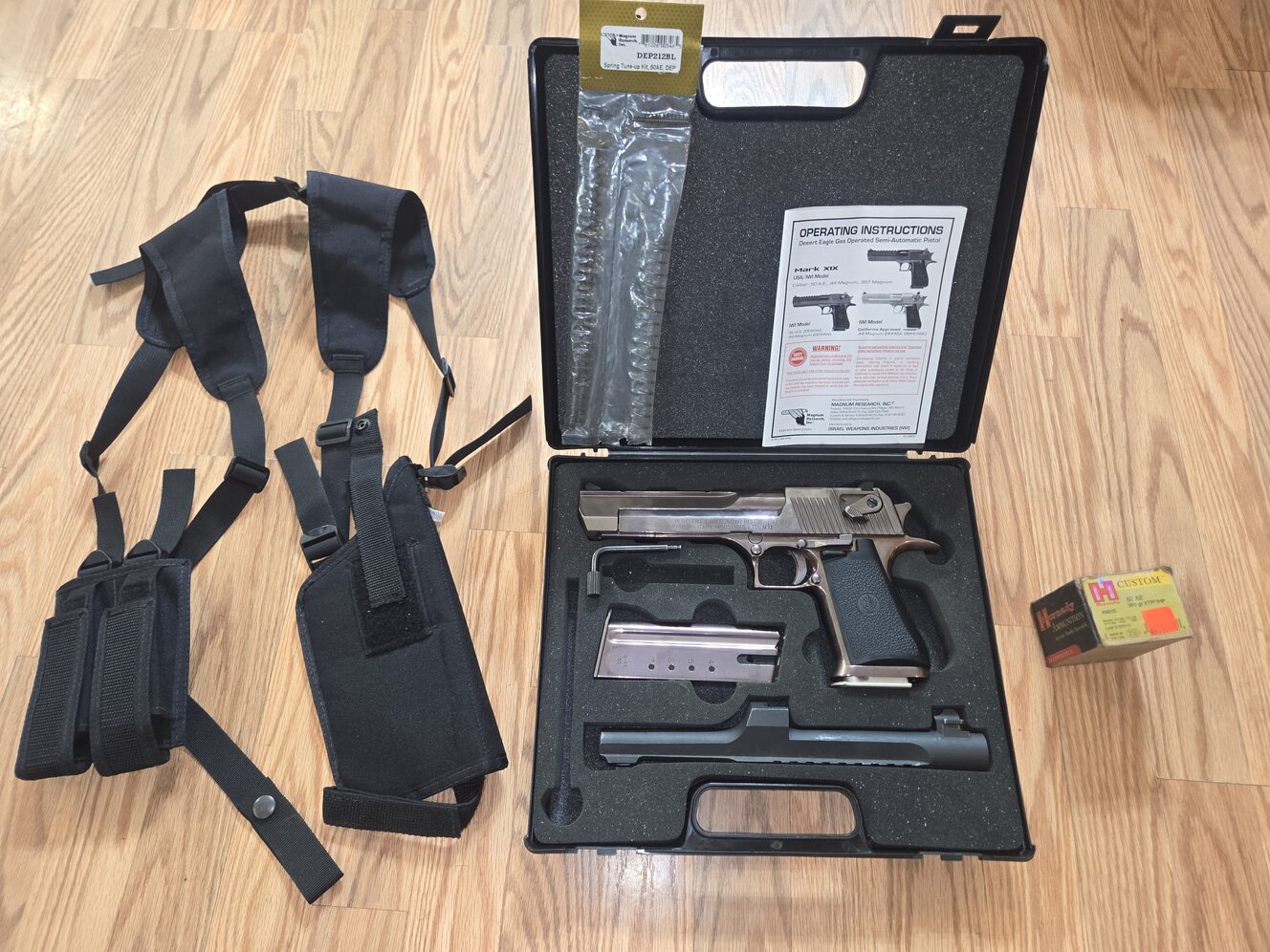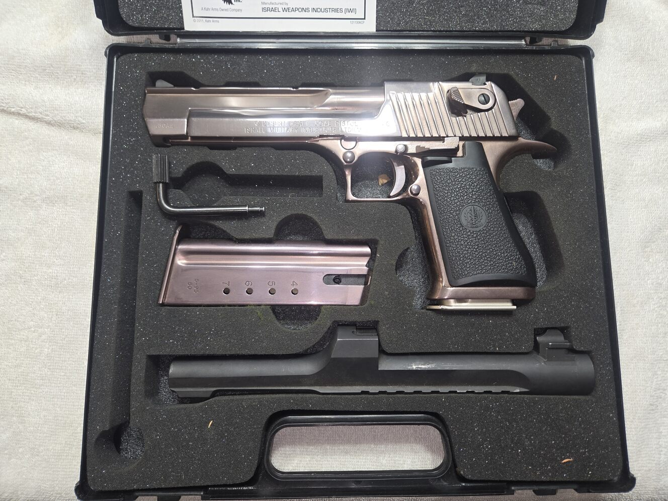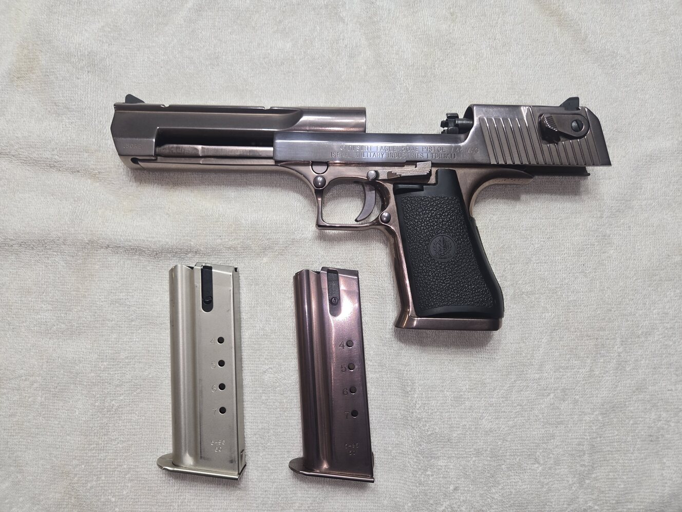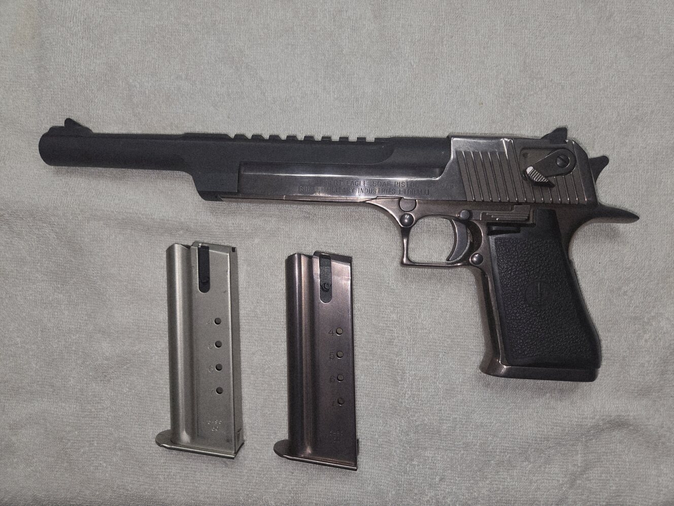 This is a limited production Desert Eagle Mark XIX chambered in .50AE with a VERY rare and desirable finish Magnum Research called "Titanium Gold". It is actually Titanium Carbon Nitride (TiCN). This finish is HARD, as in, it is unmatched at resistance against abrasion and wear, corrosion, and chemical damage; but it also has the highest lubricitiy of all the TiN coatings. To top it all off, it's beautiful, with a subtle rose gold color and nice shine. It definitely stands apart from the standard chrome or black Desert Eagles without being gaudy like the yellow gold and other exotic finishes. I believe it was the most expensive finish they offered and was only done for the limited production run in 2006. It also looks wicked with the black 10" barrel installed (can be swapped in seconds without any tools).