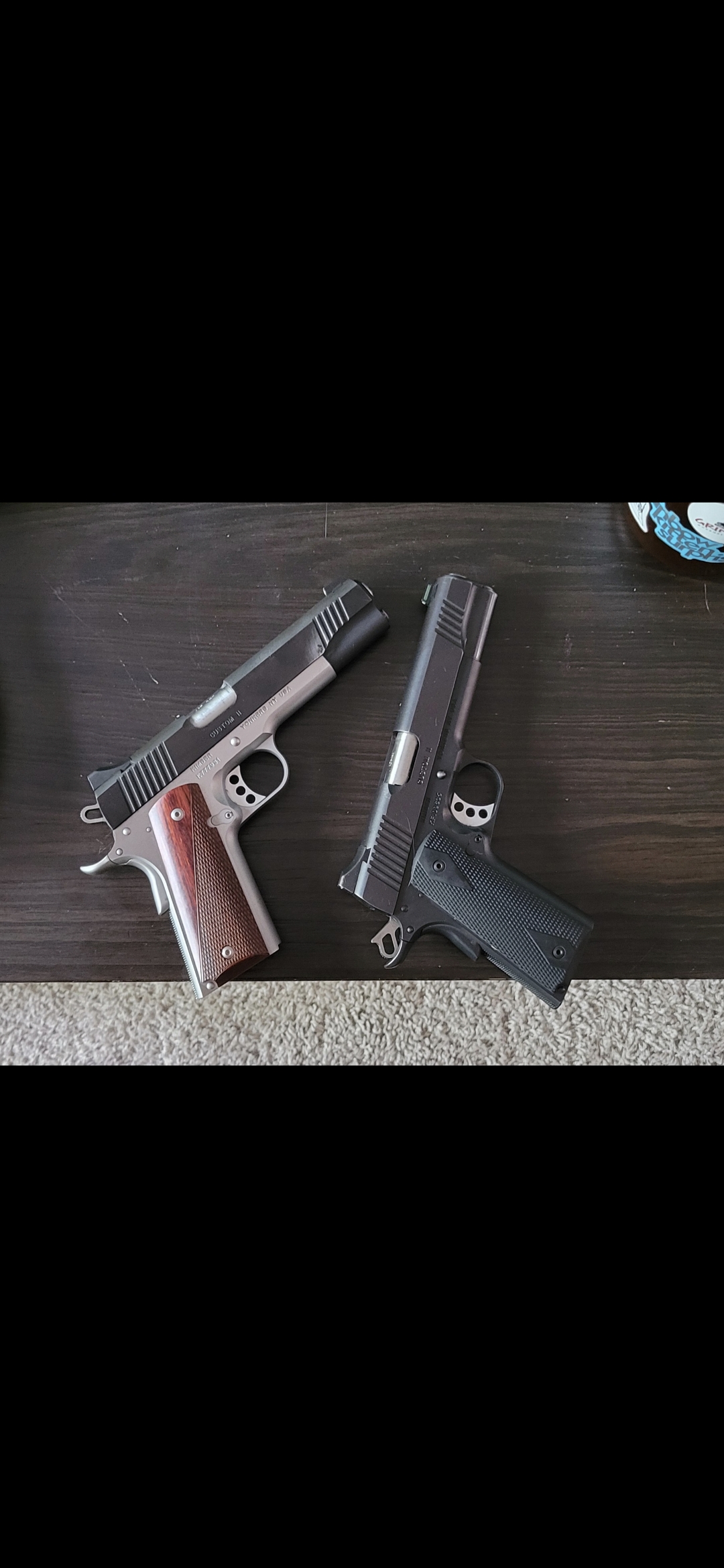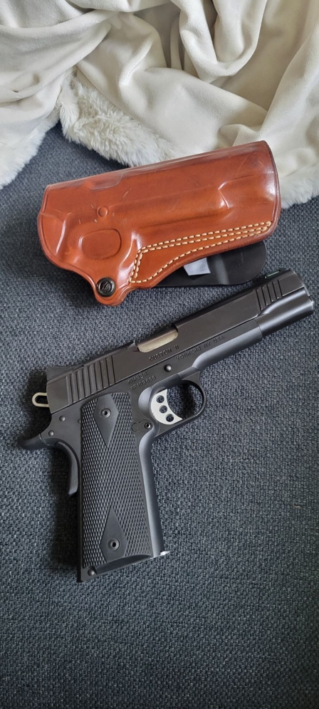 Additionally, I have a Kimber 1911, Custom II in .45acp (two-tone). It has some minor pitting on the slide, but that has no impact on functionality. $550 OBO for that one. Either of these will come with a Kenai Guide kydex chest holster for an additional $100.