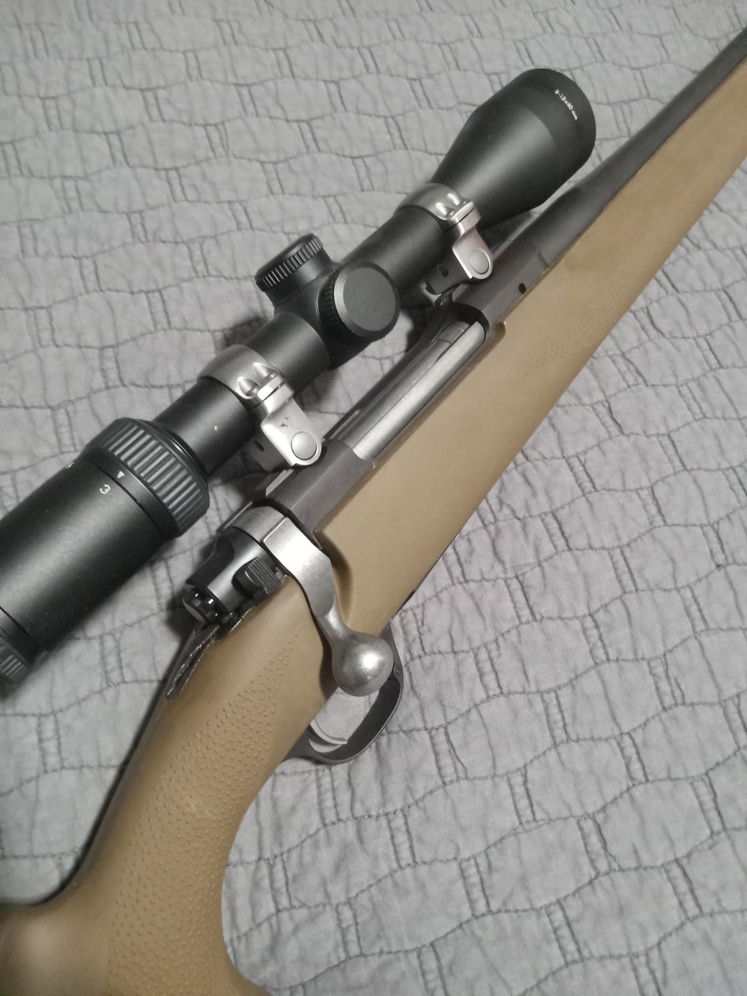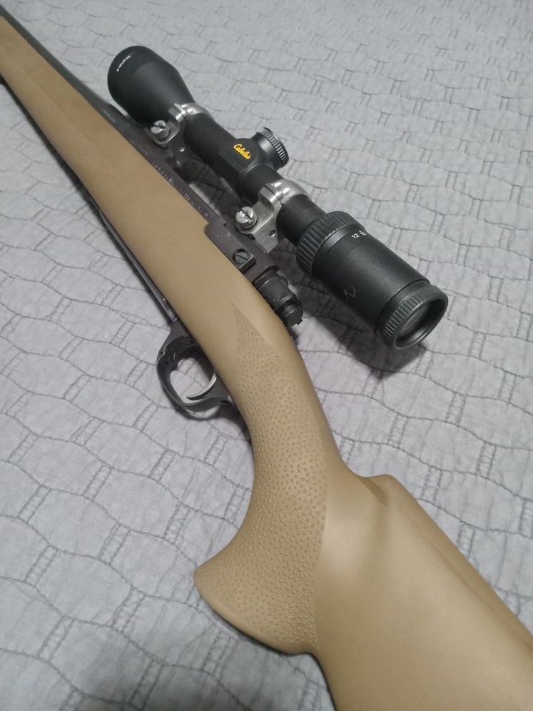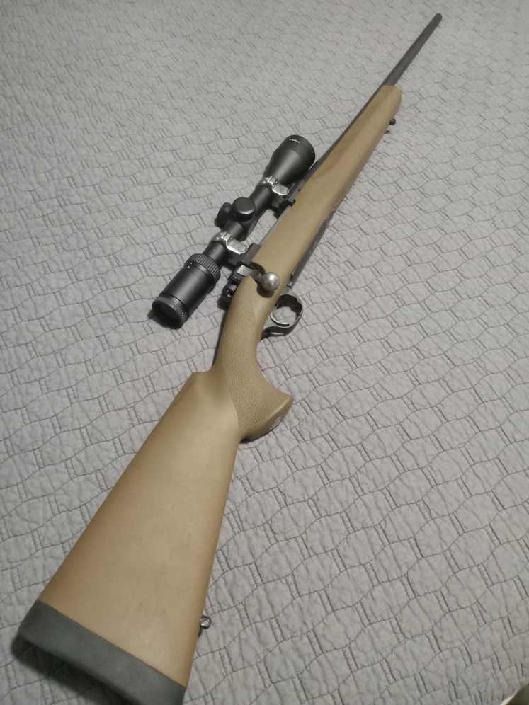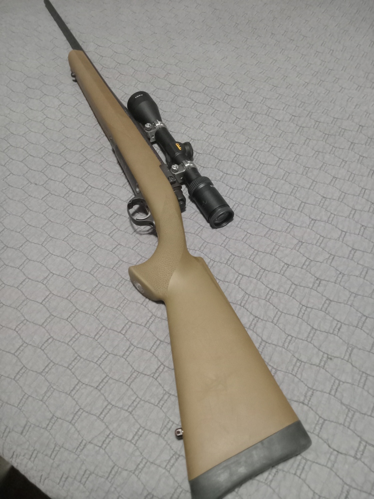Ruger M77 Hawkeye chambered in 30-06. This rifle has the Mauser 98 type control round feeding and extracting, 3 position safety, Ruger original Hogue rubber overmolded stock, and Cabelas 3-12x40 duplex BDC scope. The action is smooth and the overall condition is excellent. Great, rugged rifle for Alaska. Merry Christmas!!!