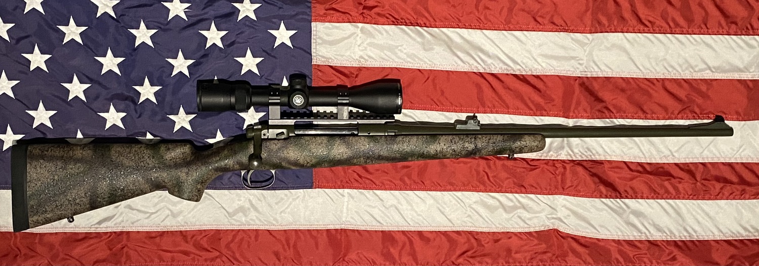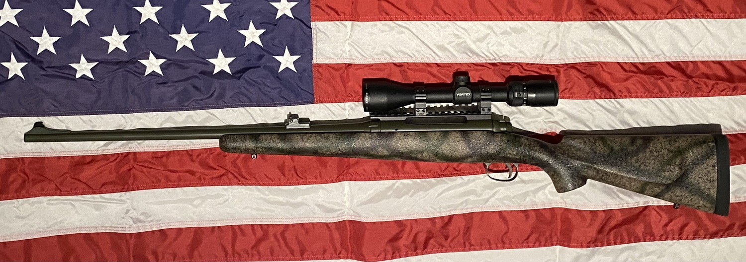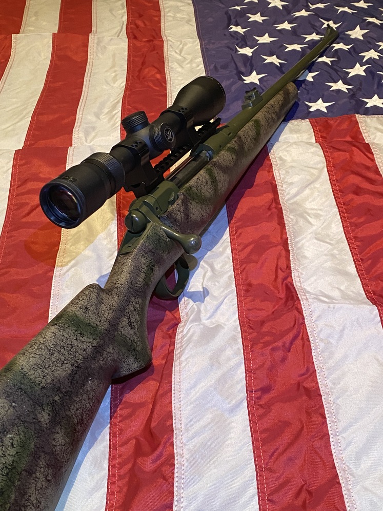 Custom Savage 110 .30-06 Springfield. Bell and Carlson stock timber camo/black spider web with full aluminum bedding block and Dark olive cerakote finish. Full length steel base, rings and 4.5-12x40 vortex Diamondback scope.
