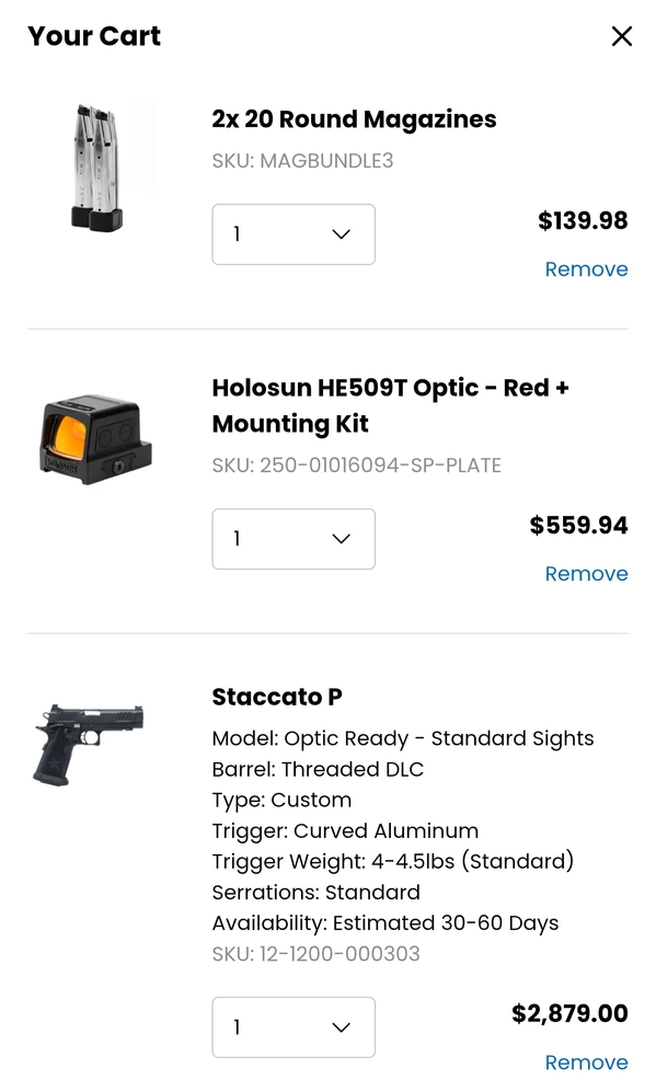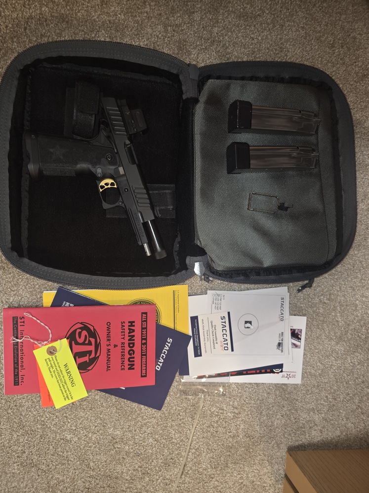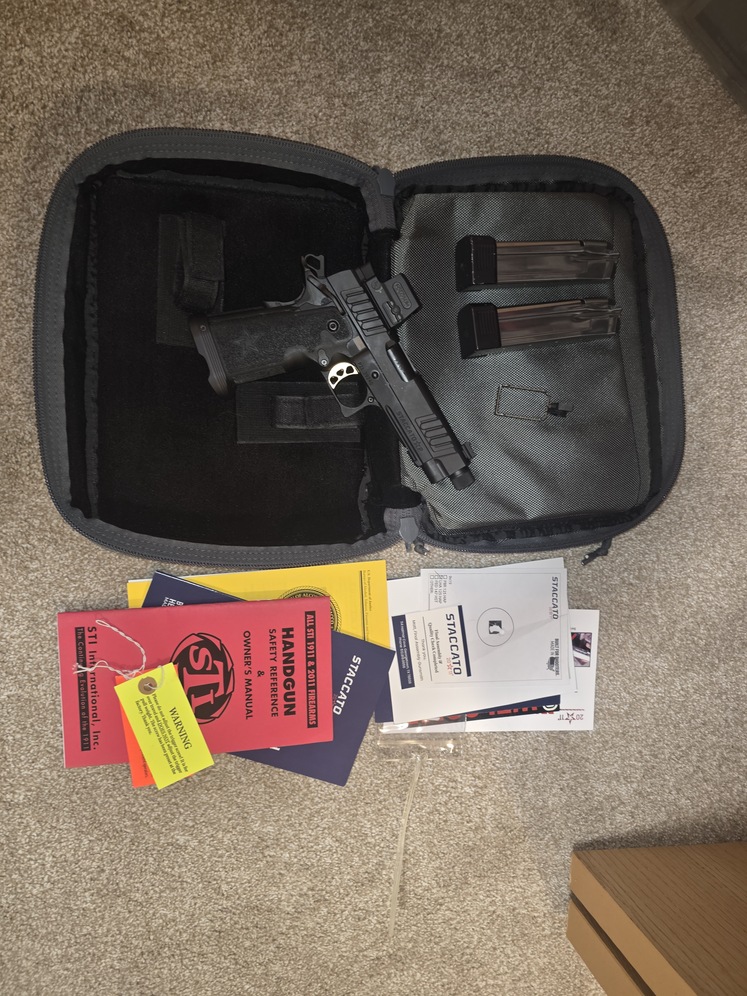 Lightly used staccato P with threaded DLC barrel with holosun 509T 2x20rd mags, original bag and all original paperwork. Lifetime staccato factory available. Right now on Staccato its 3600ish. Includes WPH holster for staccato p with light and holosun optic original box. Red dirt trigger installed, original in the bag.