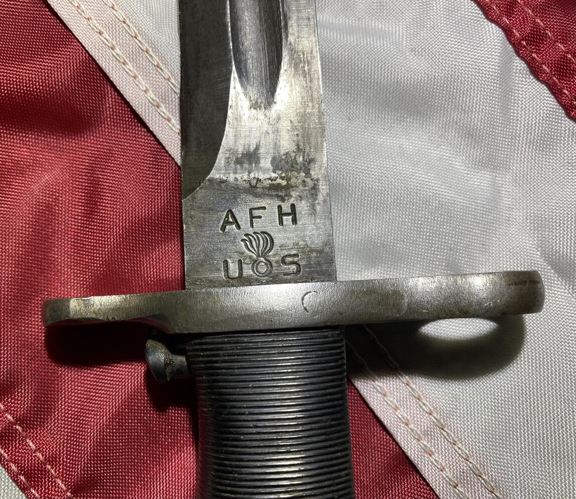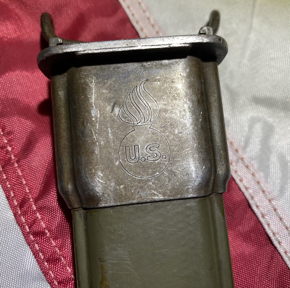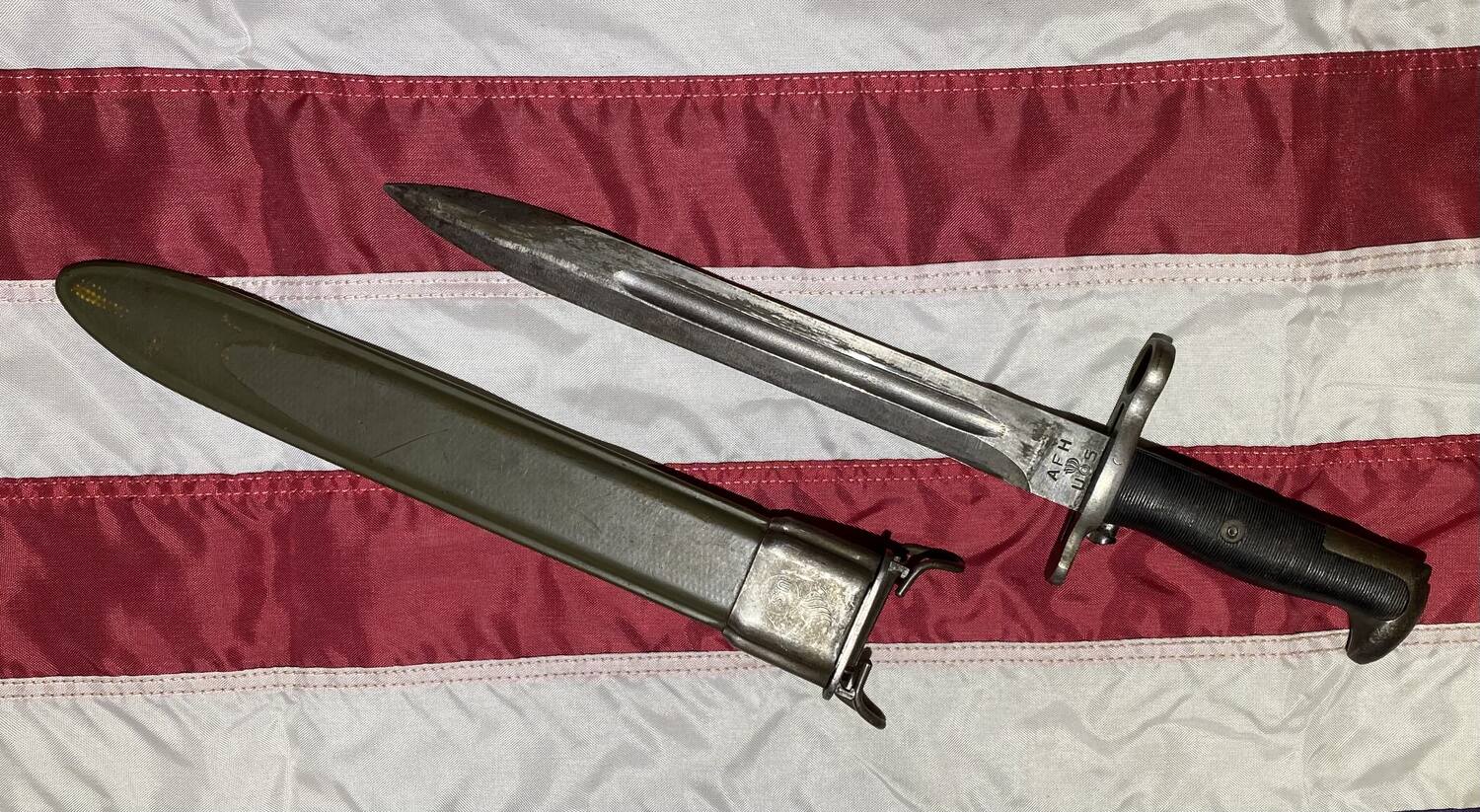 This is an original M1 Garand bayonet made in 1943 during WW2 by the American Fork and Hoe Company. Bayonet comes with its period correct scabbard. The locking mechanism on this bayonet is still functional. This bayonet is a standard 10 inch bayonet that was used by the vast majority of U.S. troops during WW2. The flaming bomb stamped on the scabbard is strong. The blade is maker marked "AFH" above the hilt as well as the standard ordinance flaming bomb and "US", all of which are strong and easily legible.