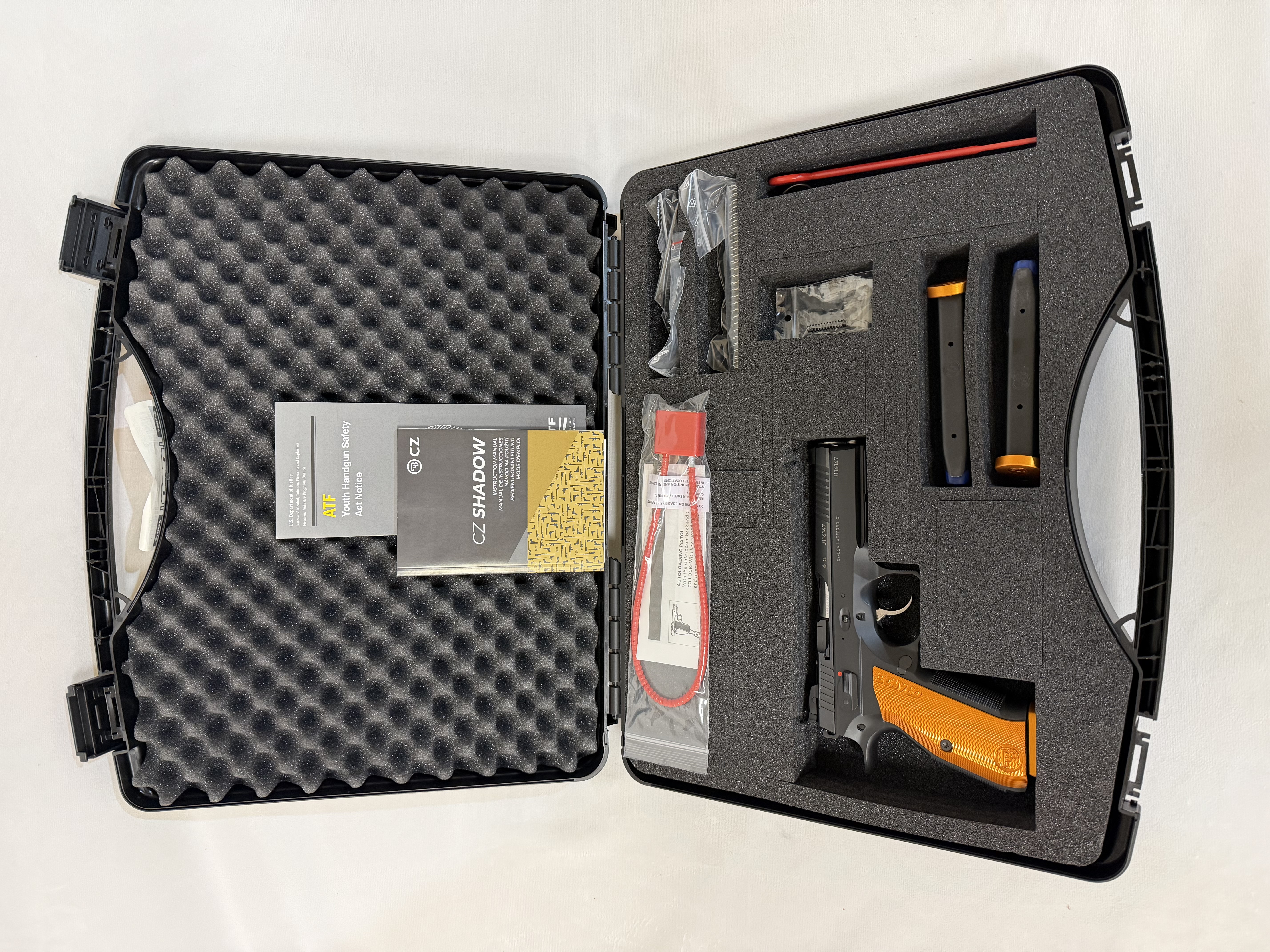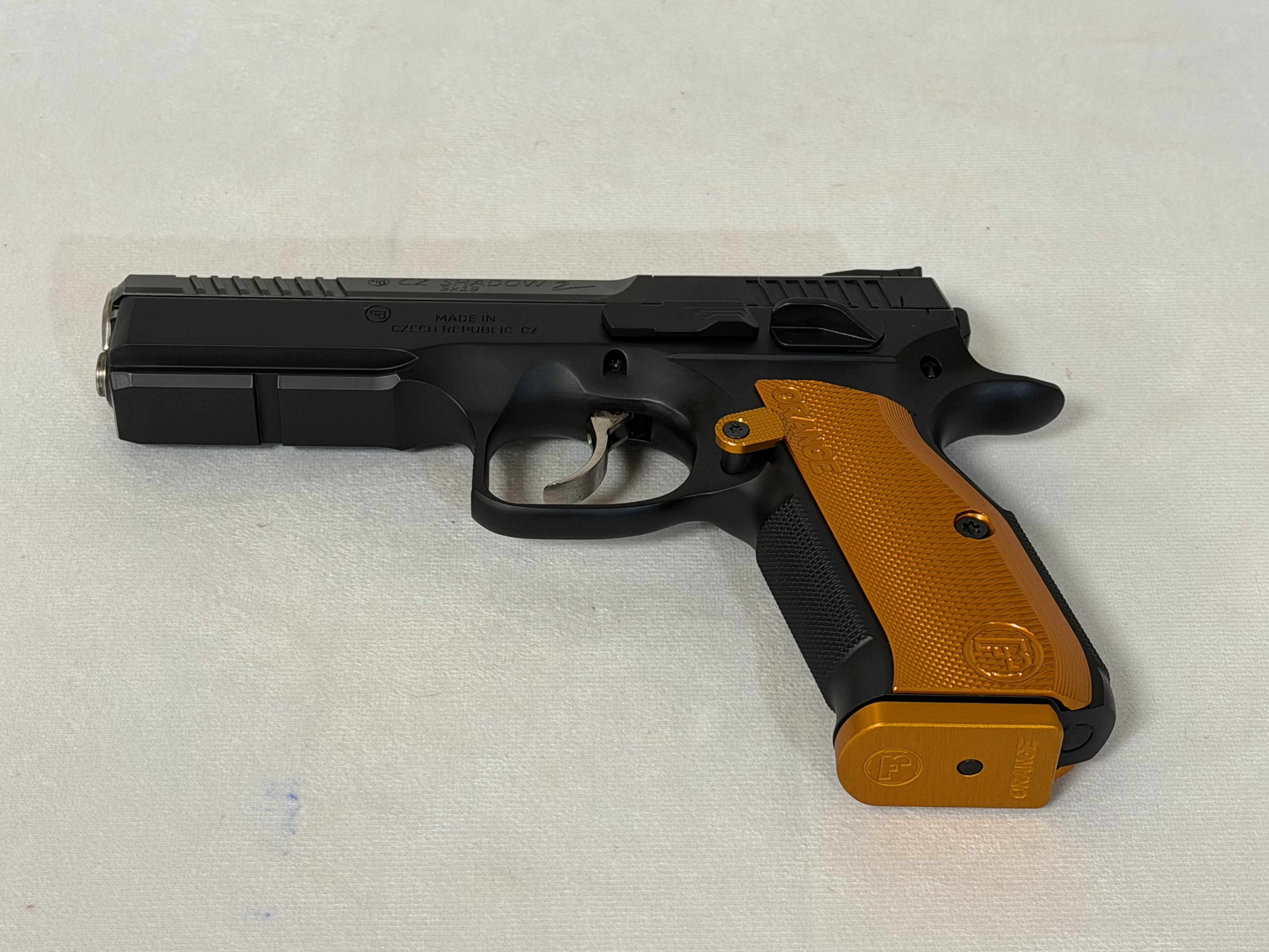 CZ Shadow 2 Orange, Optic Ready Purchased new, by me. Perfect trigger, scary accurate. Less then 500 rounds through it. Like new condition. These retail for over $2K. From CZ website: Chambered in 9mm Luger 17+1 round magazine capacity. Comes with 3 17-round magazines. Pre-cut for an optic plate system for red dot sight compatibility. Cold hammer-forged 4.89-inch barrel with barrel bushing for improved accuracy. Steel frame with nitride and polycoat finish for durability. SA/DA trigger mechanism with factory tuning and short reset. Fiber optic front sight and adjustable HAJO rear sight Hand-fitted slide and frame for superior performance. Orange aluminum grips with checkering for improved control. Adjustable, extended mag release with three settings. Overall length: 8.53 inches Weight: 46.5 oz Ambidextrous manual safety. Ideal for USPSA Carry Optics and competitive shooting. Includes all the original stuff that came with it: case, springs, manual. Plus extra stuff, all CZ OEM: 4 mags (7 total), black aluminum grips, black extended mag release, steel mag base pads. Buyer must have AK ID, be legal to purchase firearms and sign bill of sale. Cash Only, No Trades. Text if interested.