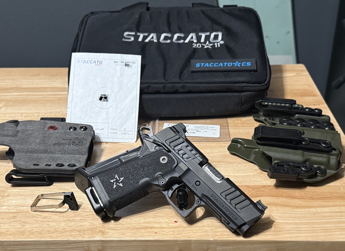 2024 Staccato CS v3. 9mm 2011. Wilson Combat High Ride Thumb Safety. Red Dirt Short Curved trigger. Short Flat included. Tenicor IWB Holster w/ Mag holder (fits gun with TLR7 light not included) Safariland IWB Incog holster (fits bare gun). 2 15 rd Magazines Staccato case and all paperwork. No trades.