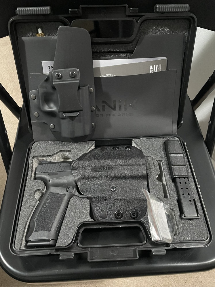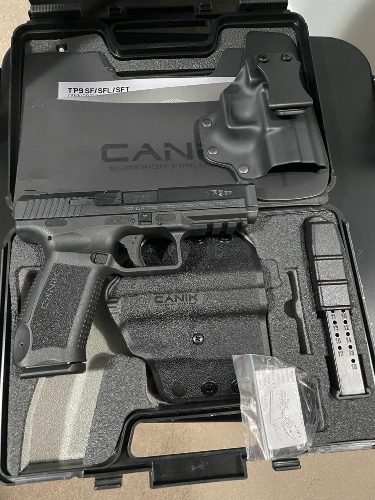 New in box Canik TP9SF 9mm Includes Factory Case, OWB Canik Kydex holster, IWB Hybrid holster, 2-18 round magazine. Buyer must Show Alaska ID and Fill out bill of sale form be legal to own and purchase firearm. NO TRADES asking $500