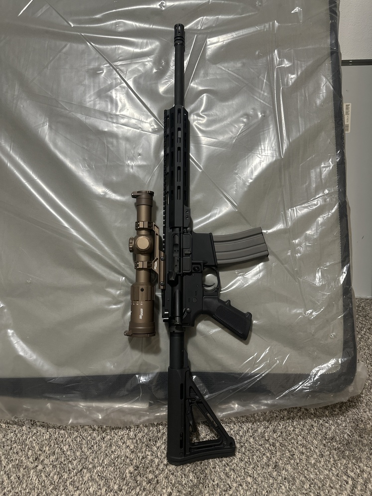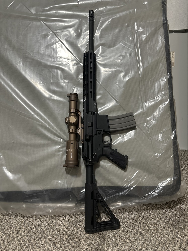 Delton A.R. 15 $600 With an upgraded barrel $250 Mag pull furniture with a Sig Sauer tango MSR 1-6x24 Lpvo $300 with one magazine $1100 or obo