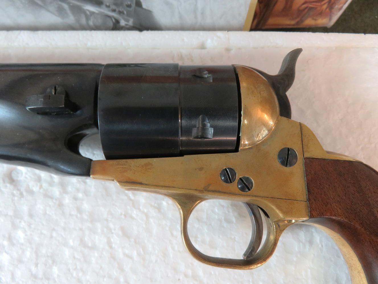 1860 Army Steel .380 Blank Revolver Brand: F.LLI Pietta Made in Italy -Case hardened blue steel -Brass back strap and trigger guard -.380 caliber blank (Per the manufacturers information): “These Civil War Replicas may not be disassembled. There is a hardened steel pin that goes thru the wedge, and into the cylinder, so it is impossible to take apart. For cleaning, you can use a spray gun lube or cleaner and brush. Manufactured to appear authentic, they CANNOT BE ALTERED TO FIRE LIVE AMMUNITION. These blank firing revolvers are designed for the cylinder to line up in first position, only, for loading and unloading so the blank ammo will not fall out, even though the revolver does not have a loading gate.” With original box and manufacturer’s instructions. In very good condition. Public meet-up Cash only, please Thank you for looking