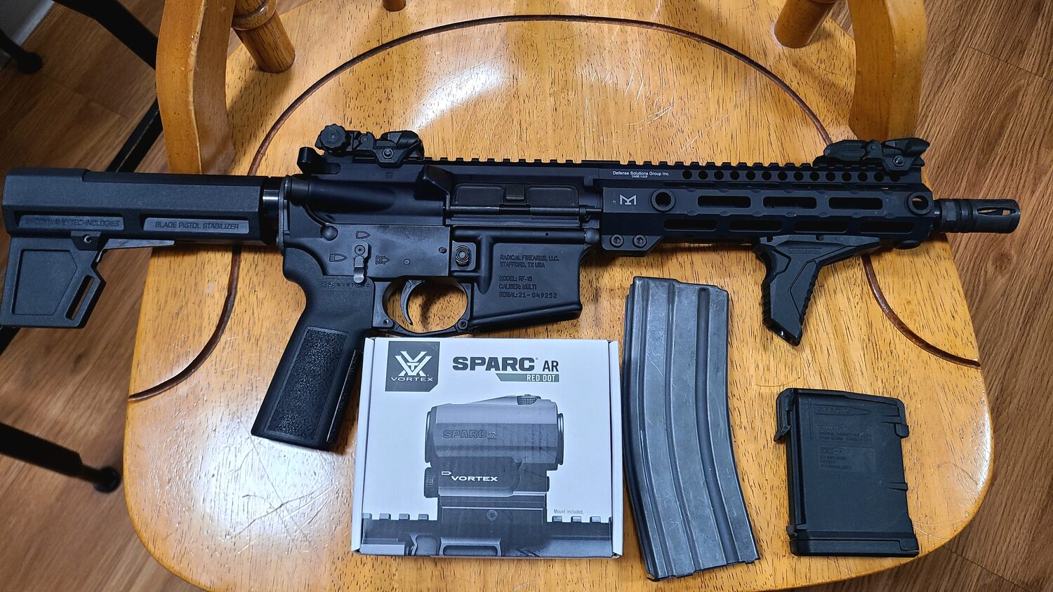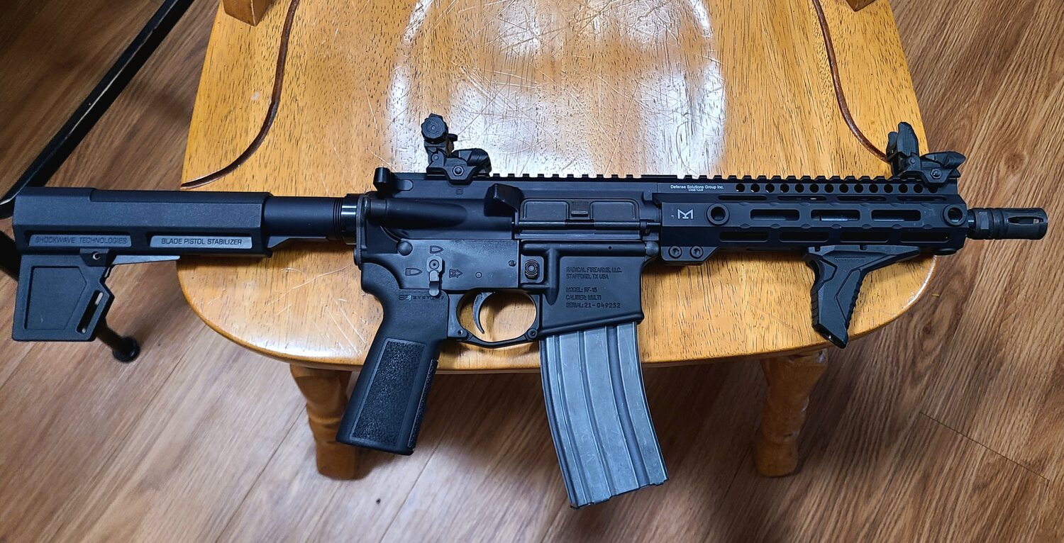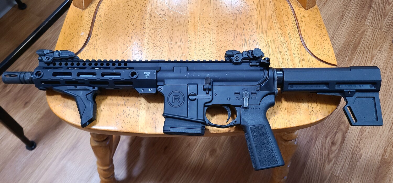 DSG Arms .300 Black out upper, 9” barrel, 8” M-lok free float tube with built in QD sling swivel points. Vortex SpARc red dot optic new in box. Radical arms lower receiver with ambidextrous safety, QD sling swivel receiver plate, silent captured buffer spring, and KAK shockwave arm brace. Comes with 1 30 round aluminum mag and 1 10 round Magpul polymer mag. Zelle, cashapp, venmo, paypal, or cash. Must show ID and sign bill of sale. $600, no trades.