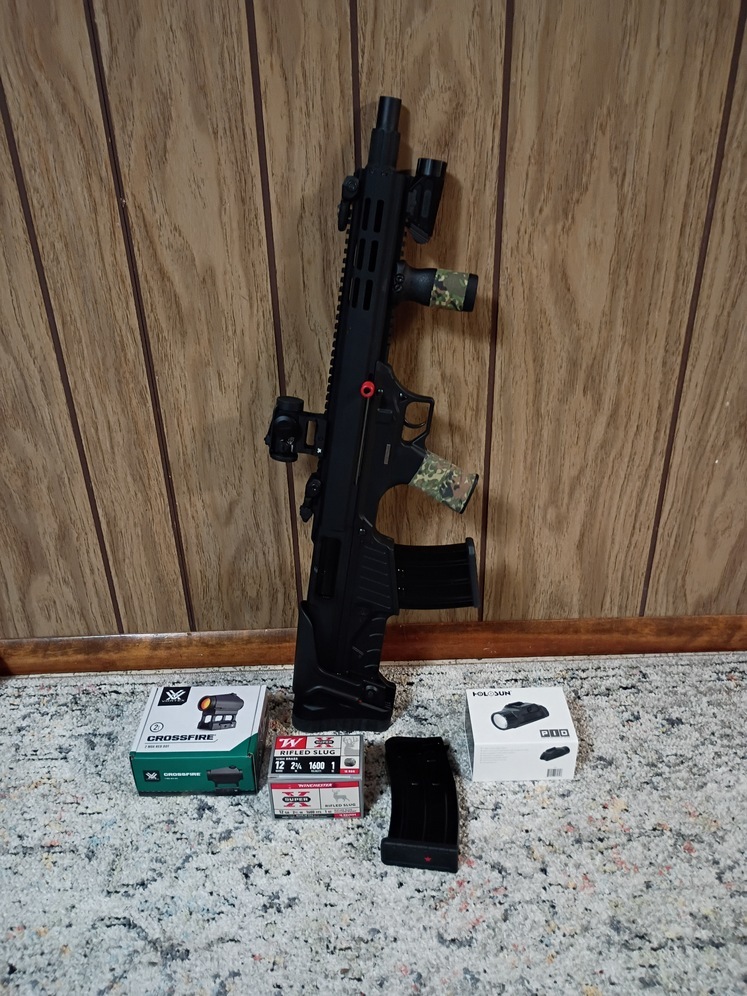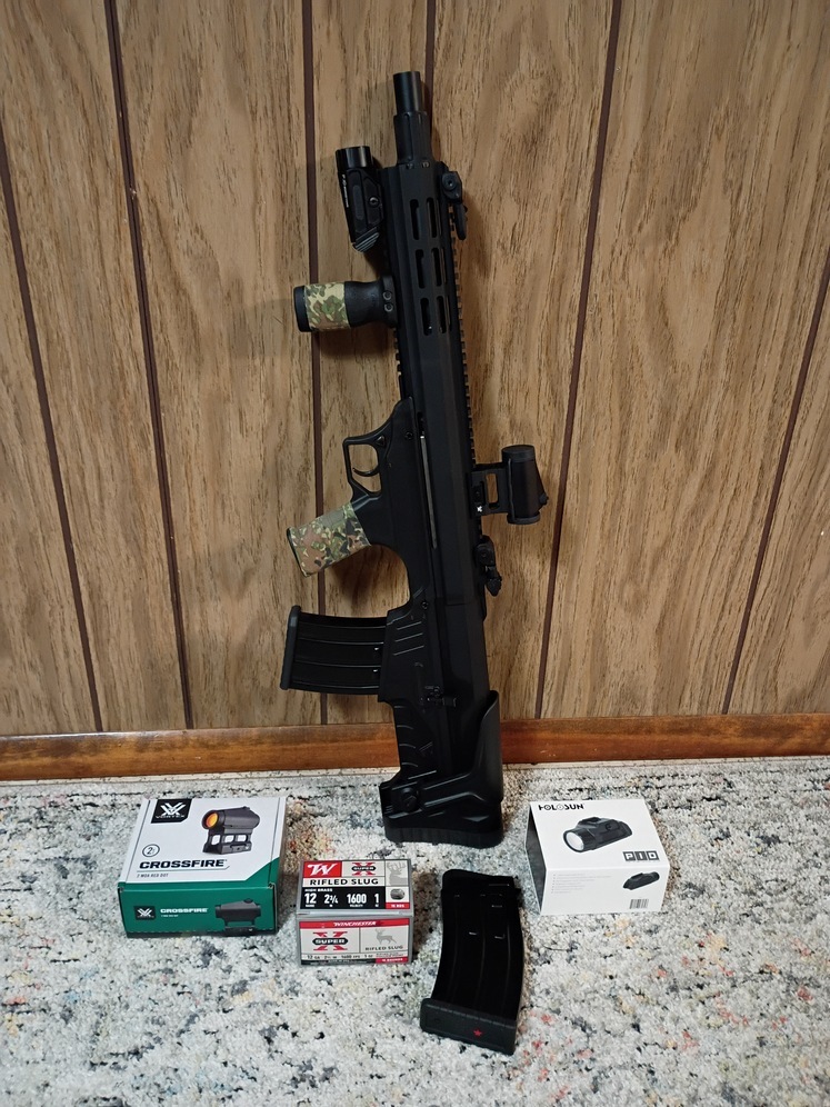 SDS Imports BLP M12 Semi-Auto Bull Pup shotgun. Comes with two 5 round mags, Vortex Crossfire 2 MOA red dot, Halo Sun P.I.D light, Magpul R.V.G. foregrip, factory flip up sights(co-witnessed) and a box of 15 slugs. Takes Benelli/Beretta Mobil chokes, I.C. choke installed. 40 rounds of shot put through it for action break in. Shoots great just moving on to something geared more towards bird hunting.