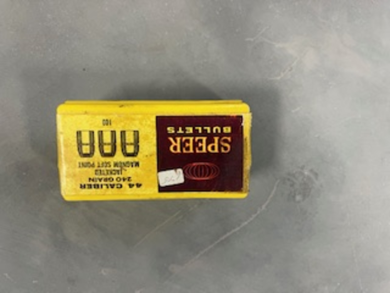 Speer 44 Caliber 240 Grain Jacketed Magnum Soft Point. Box is open and 97 bullets are present.