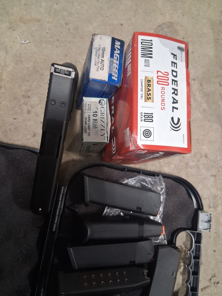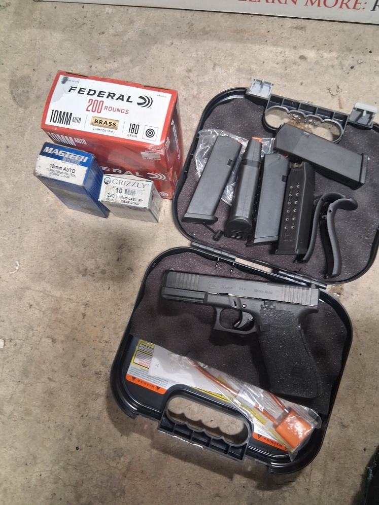 I am selling a Glock 20 MOS Gen 5. This has the cut out to mount a red dot if you like. This is a very impressive gun, the newer Glocks have improved on the older Glocks in small ways that make a difference. The gun comes with extra mags, 200 rounds of Federal 180 gr FMJ ammo, 20 rounds of 22 gr Grizzly Ammo, and 50 rounds of Magtech 180 gr FMJ ammo. Also included are the box and accessories. Only selling because I don't need another bear gun. If you bought all this new it would be about $850. I'll sell it all for $700. Sold as a package deal only. Will not sell separately