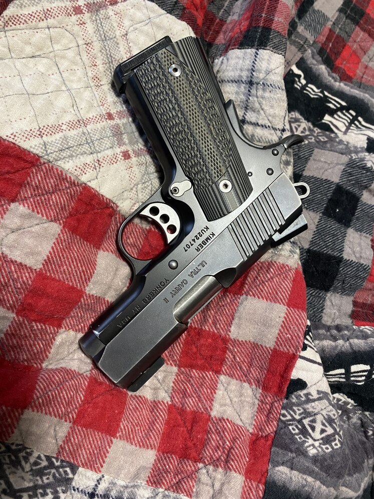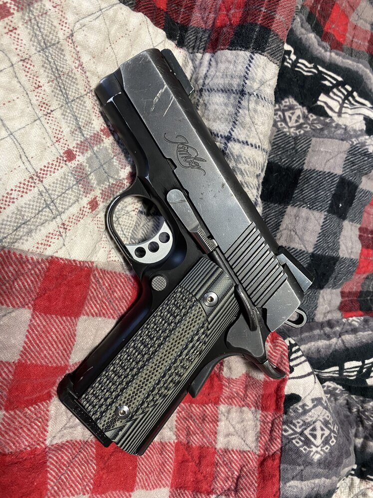 Carried and used Kimber pro carry 2, aluminum frame. Added night sights, Vz g10 grips, and a Wilson combat magazine. Replaced the factory plastic mainspring housing with a steel one. The plastic one failed under its own spring tension. Some scratches on the left side of the slide from taking a spill. Normal holster wear on the corners of the frame. I meet in wasilla and will toss in 100rds of factory ammo