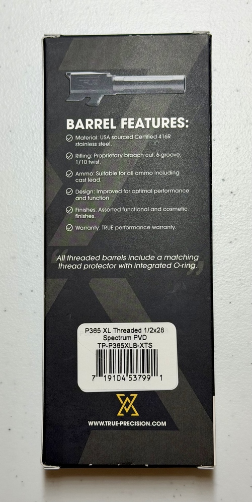 Brand New True Precision Sig Sauer P365XL Threaded Barrel in Spectrum Rainbow Color. Designed for: 3.7" P365XL, XMACRO & XMACRO Tacops 9mm - Threaded Length: 4.35" overall Rifling Proprietary broach cut, 6-groove, 9mm 1/10RH twist, suitable for all ammo including cast lead Material: USA-sourced certified 416R stainless steel Chamber: SAAMI spec 9x19 Luger Barrel: 1/2x28 threads (threaded) Threaded Model: Includes high-heat integral O-ring lock thread protector Design: Does NOT retain the LCI cut-out.