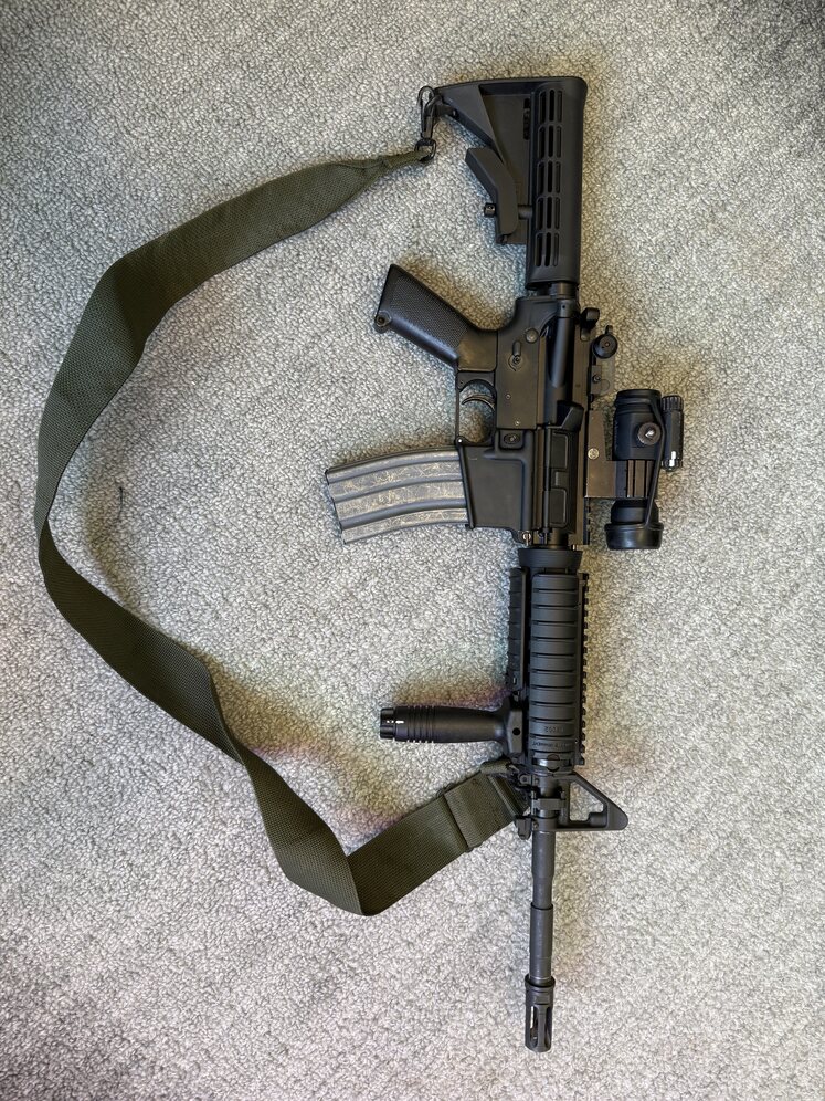 Colt M4A1 Clone build. SOCOM upper with pin and weld surefire birdcage. Comp M2 red dot. Knights furniture and a Giselle 2 stage trigger. The lower is a Colt Match competition. Comes with 1 Colt magazine.