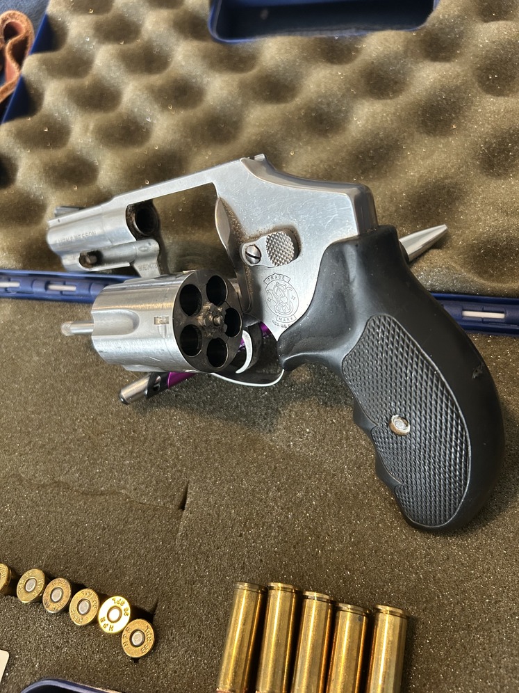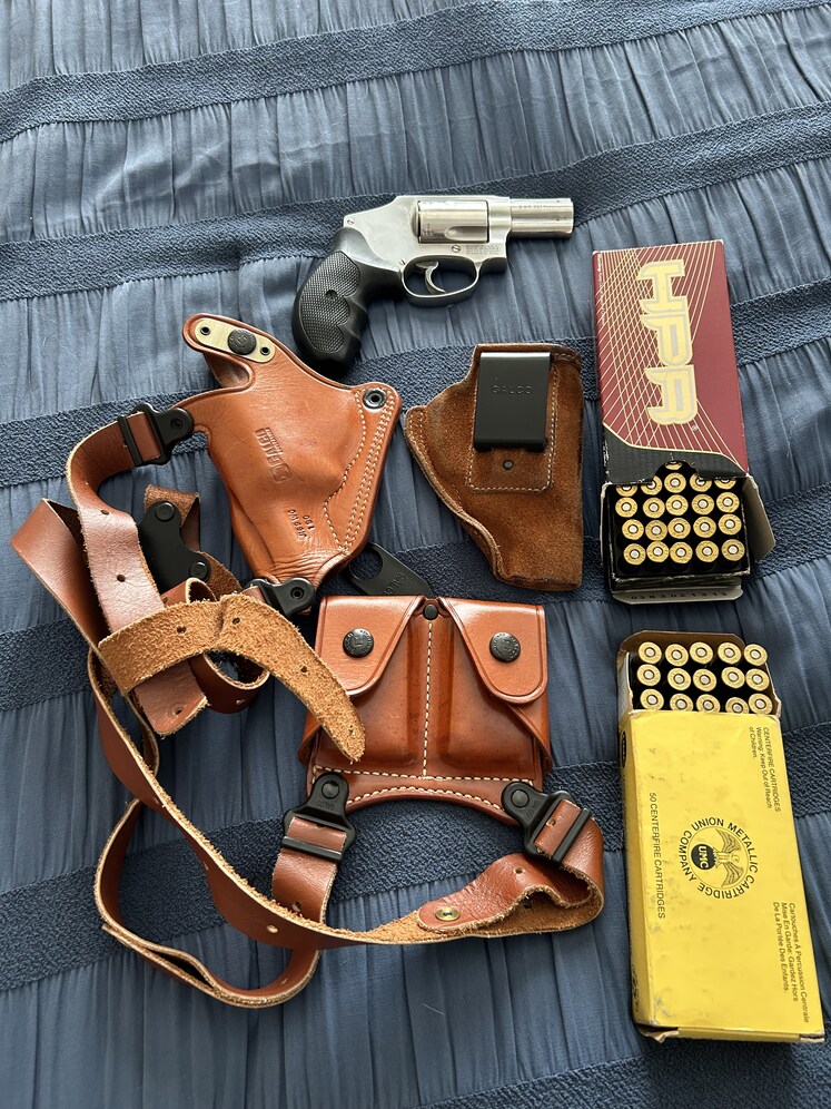 Smith & Wesson Model 642 chambered 357 in stainless steel. 17/8” barrel, hammerless, 5 shot make perfect concealment possible. Packmyre grips for sure holding. Never fired, comes with shoulder draw and belt draw holsters and two full boxes of 158gr ammunition ($72 dollar value). $625. Wasilla area, cash sale, call or text Bob.