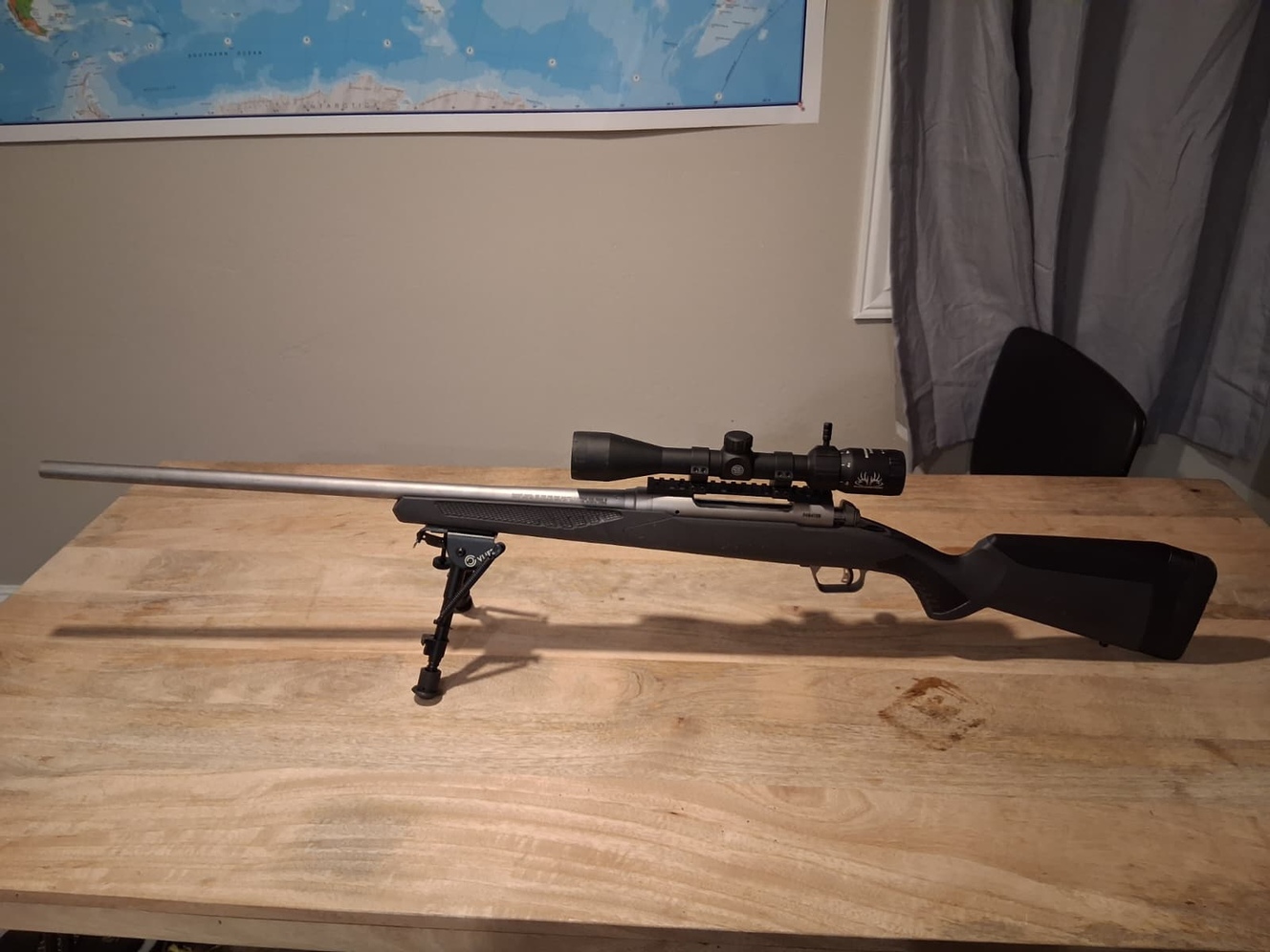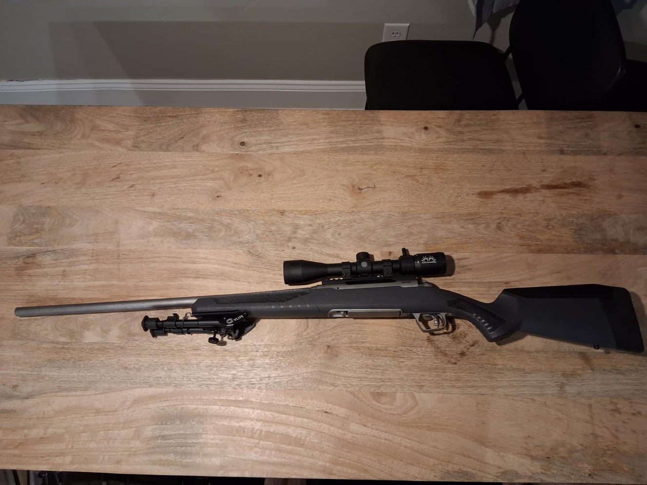 Good rifle for hunting and distance shooting. Lightly used, less than 50 rounds sent downrange. Detachable box magazine holds 3 rounds. Sig Sauer Buckmaster 3-9x40mm optics placed and zeroed in last year. Bipod attached as well.