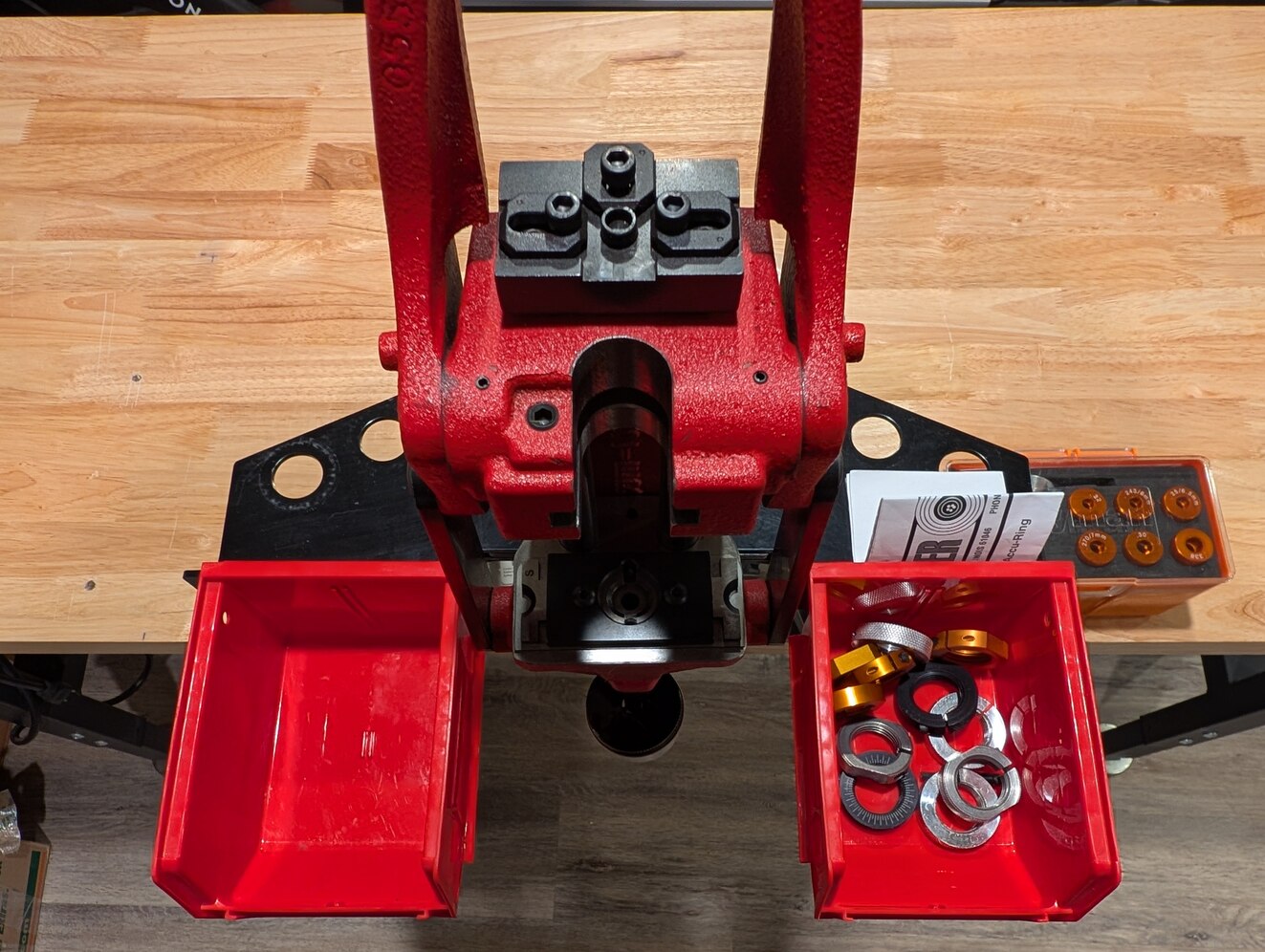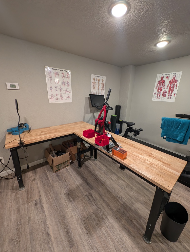 Reloading Bench Setup. Sold as a package deal only. Will not sell separately. Includes the following: 2 height adjustable Workpro benches w/ built in power strip, 60"x22"x1.125" tops. Capri tools forged vise 4" jaws + magnetic soft jaw covers. Forster co-ax press w/ replacement jaw pressure springs, LED light kit, and dust cover. Inline Fabrications 7.5" co-ax Ultramount system w/ die holders and two storage bins. Lyman powder funnel kit (.22-.338 cal). There will be holes and witness marks from previously mounted equipment. The benches are sturdy and will work just fine. The Co-ax press has been seldom used. I'm selling this setup because I've upgraded to larger benches and a Nexus press. Local sale to Fairbanks is ideal. Pick-up only. Cash preferred.