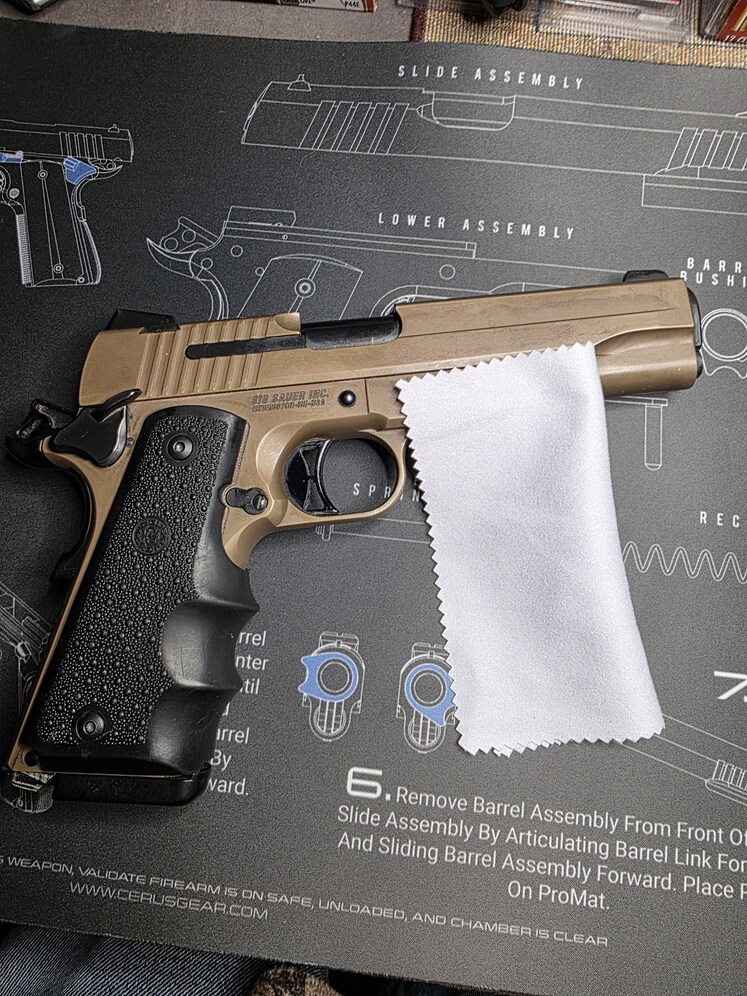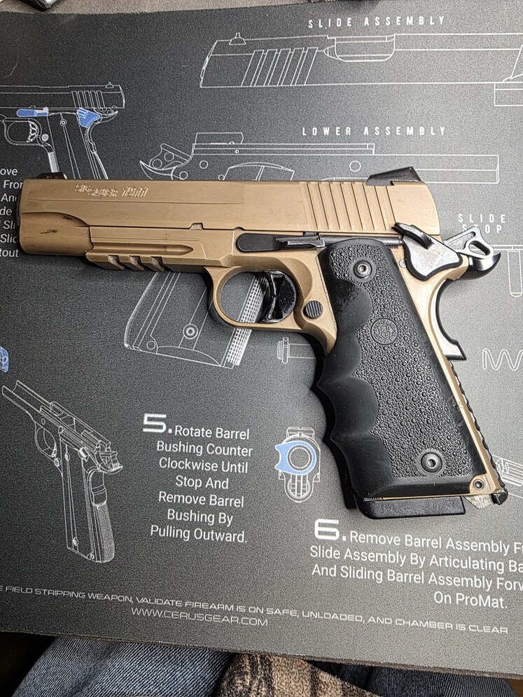 Sig 1911 in 10mm. Won't be long and bear season will be here. This is a great EDC for the woods. Flat dark earth, excellent accuracy, good condition and comes with Hogue grips and two magazines. Comes with Sig 1911 case but not matching numbers.