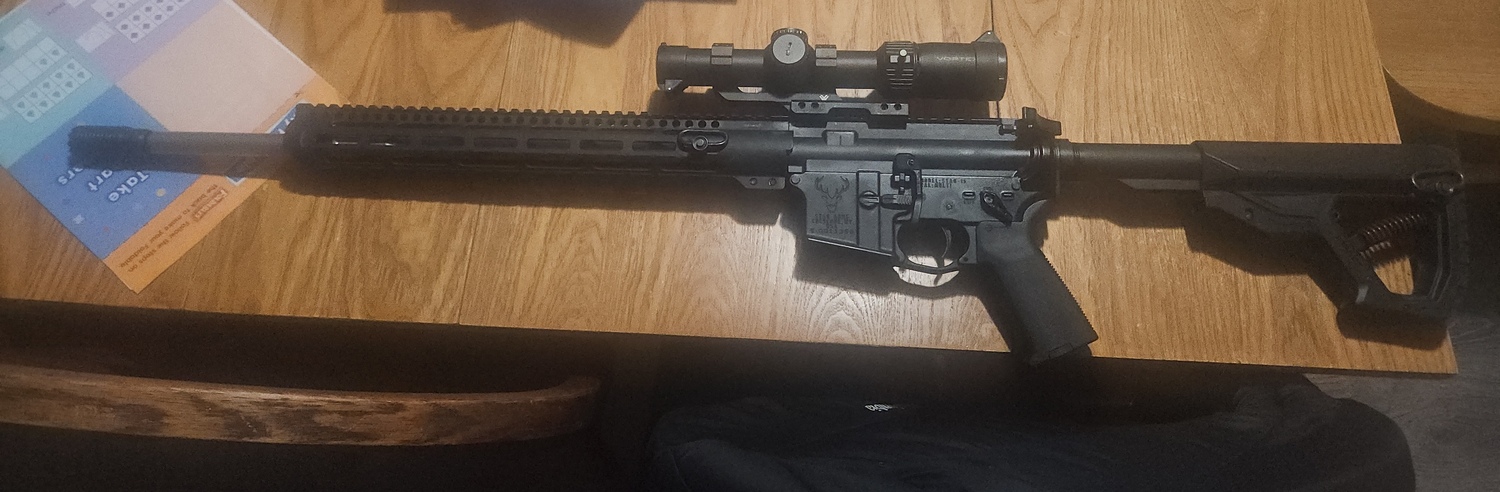 Stag lower, spikes upper, adjustable gas block rifle length, stainless 18" Rosco .223 wylde 1:7.5 barrel, linier muzzle break, ambi selector, mag release, charging handle, and bolt release. Has a vortex strike eagle 2 LVPO 1-8-24 with illumination, fail safe bolt, kynshot hydrolic buffer, gl impace core 2 stock, multiple magazines. Range bag and extra parts.