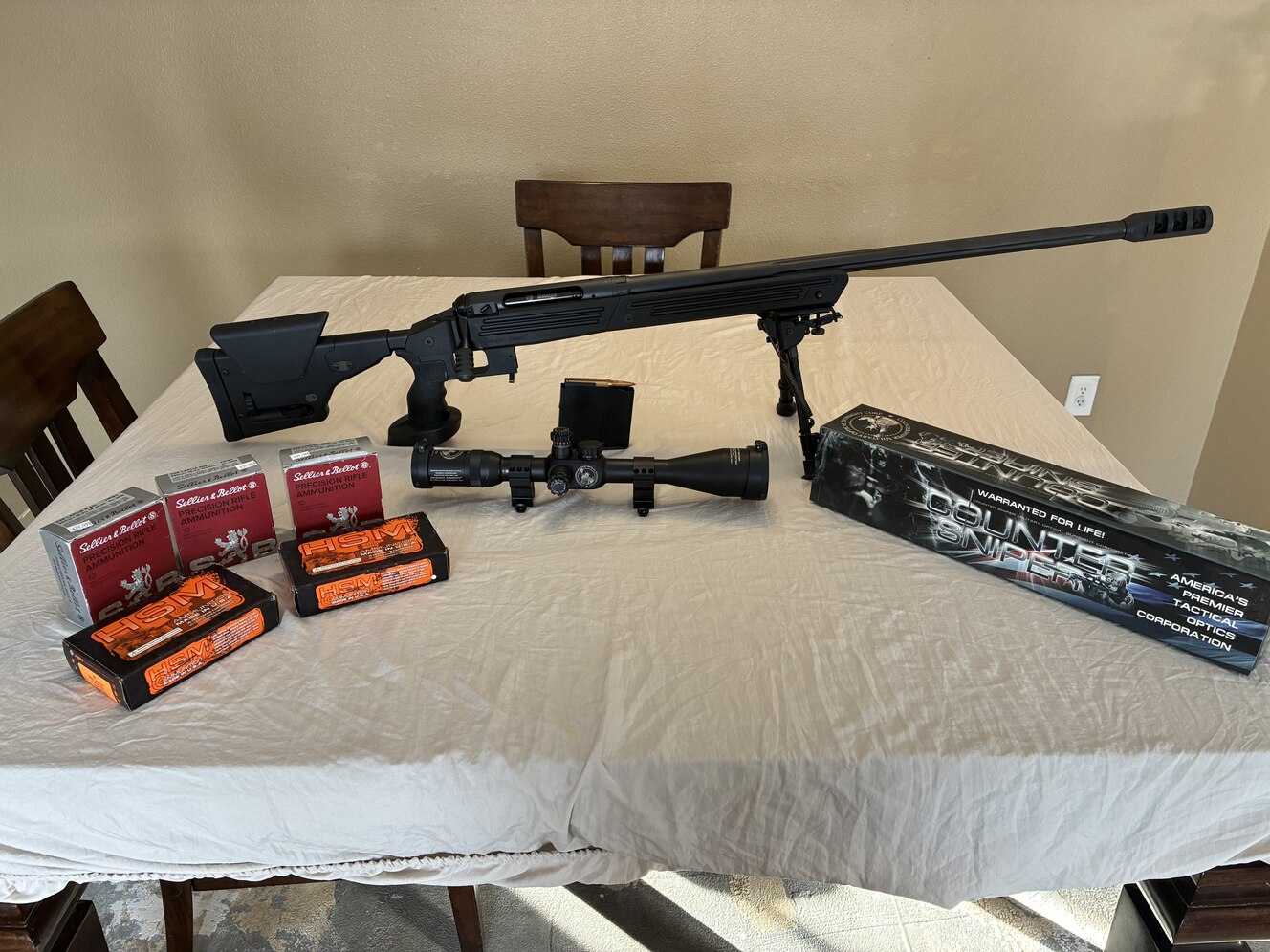 Savage 110 Lupa Magnum, never fired. Comes with a Counter Sniper Optical Scope (30mm Tube 4-16x50mm. Side focus, first focal illuminated Mil-Dot reticle matte. Also comes with 5 boxes of ammo.