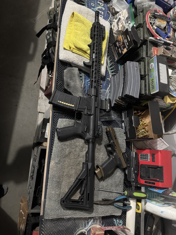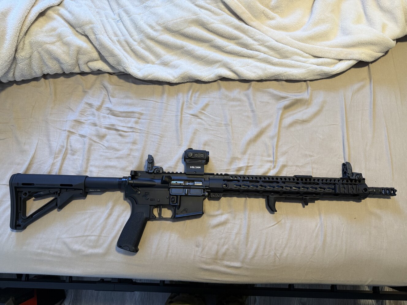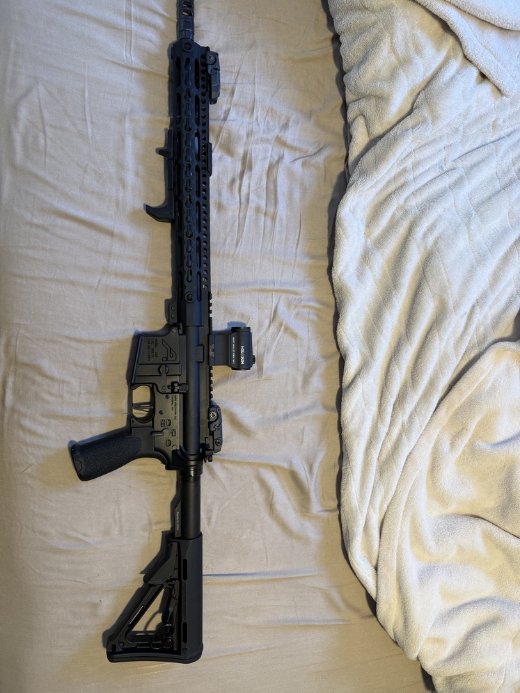 Ar15 16 inch barrel chambered in .300 blackout. Midwest industries upper receiver, aero precision lower receiver, cmc 2lb flat face trigger, magpul fore grip, magpul butt stock, armaspec buffer system, magpul quick flip iron sights, holosun red dot, and a nickel plated bolt carrier group, comes with 8 magazines and 500+ rounds 1700 with everything Feel free to message me if you have any questions