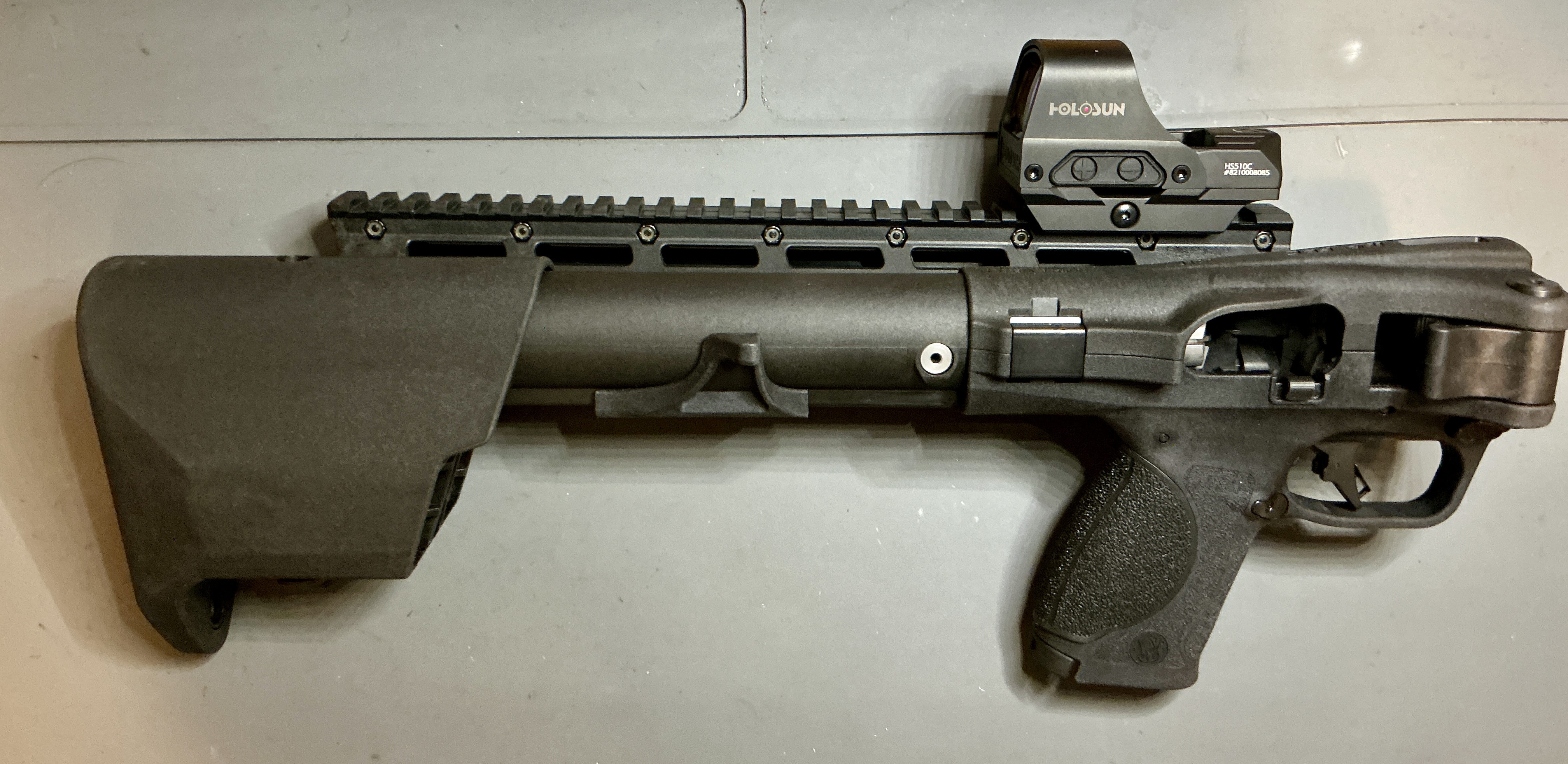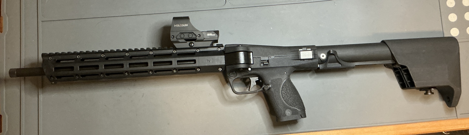 SW .22lr folding carbine. Like new, less than 200 rounds. Threaded barrel. Comes with 3 magazines, box. $475 without the Holosun optic. $700 with Holosun 510c optic. Cash only, must be willing to sign bill of sale. Text if you have any questions or need more pics.