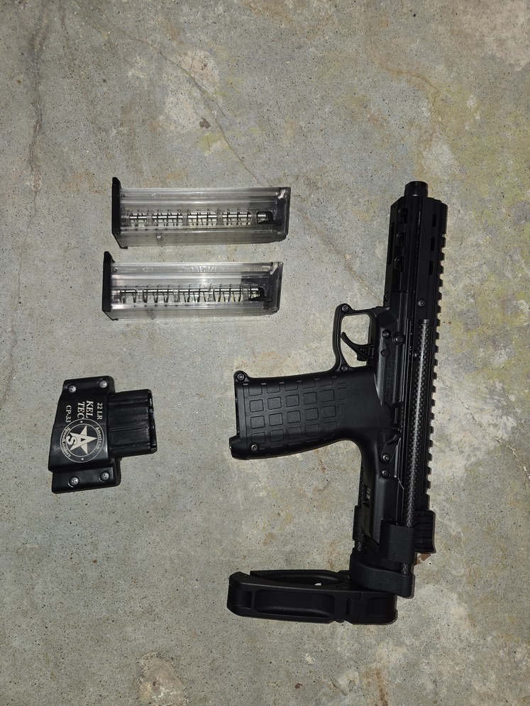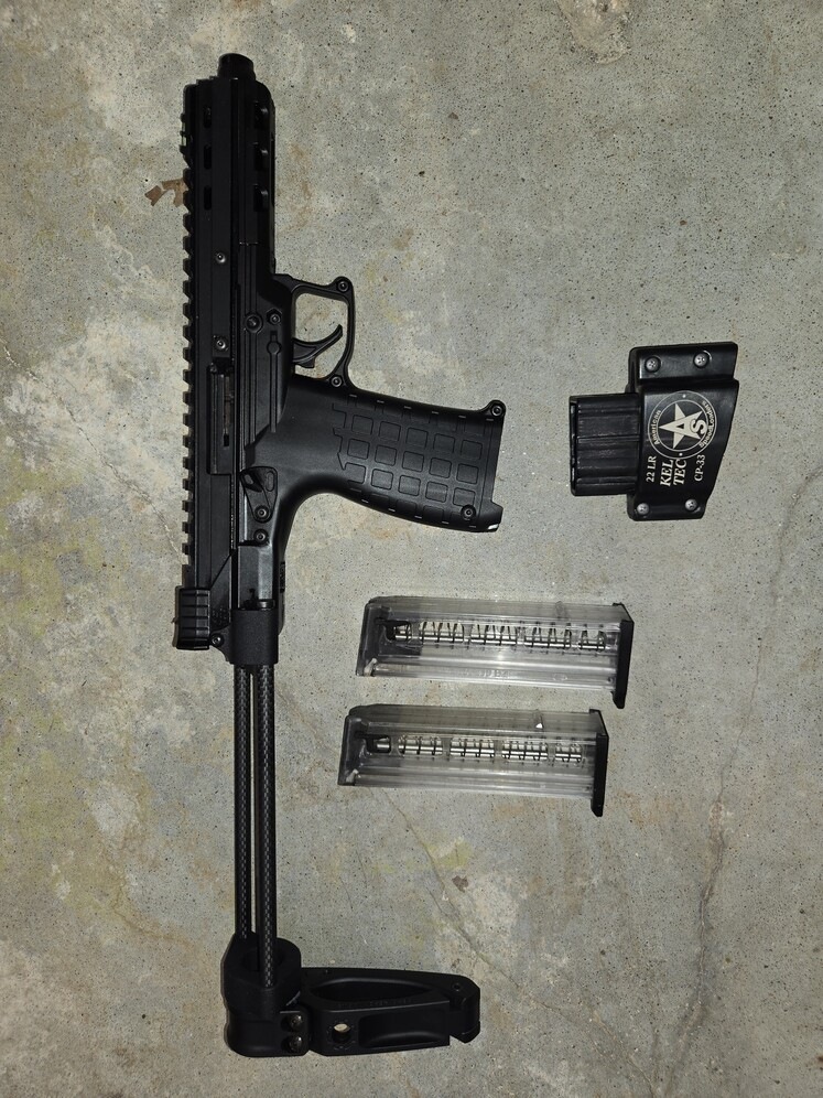 I'm selling my Keltec CP33 in .22lr. It has a carbon fiber Farrow brace, a threaded barrel and fiber optic sights. It comes with (2) 33 round magazines and a magaine speed loader. It runs great with a suppressor and it's a good gun for kids or plinking. Text or call me if you have any questions. Not interested in trades. Thanks for looking.
