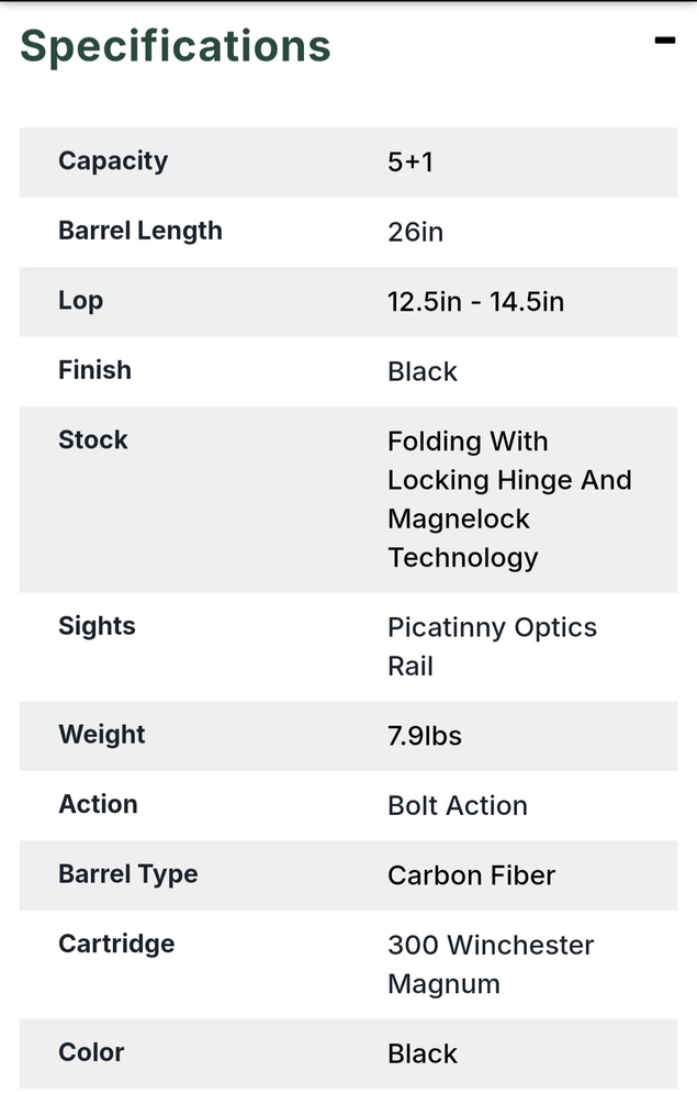 Christensen arms mpr 300 win mag with vortex viper pst 5-25x50 ffp scope also comes with three 5 rounds magazine. Bought it and took it to the range a few times and now just sits in the safe.