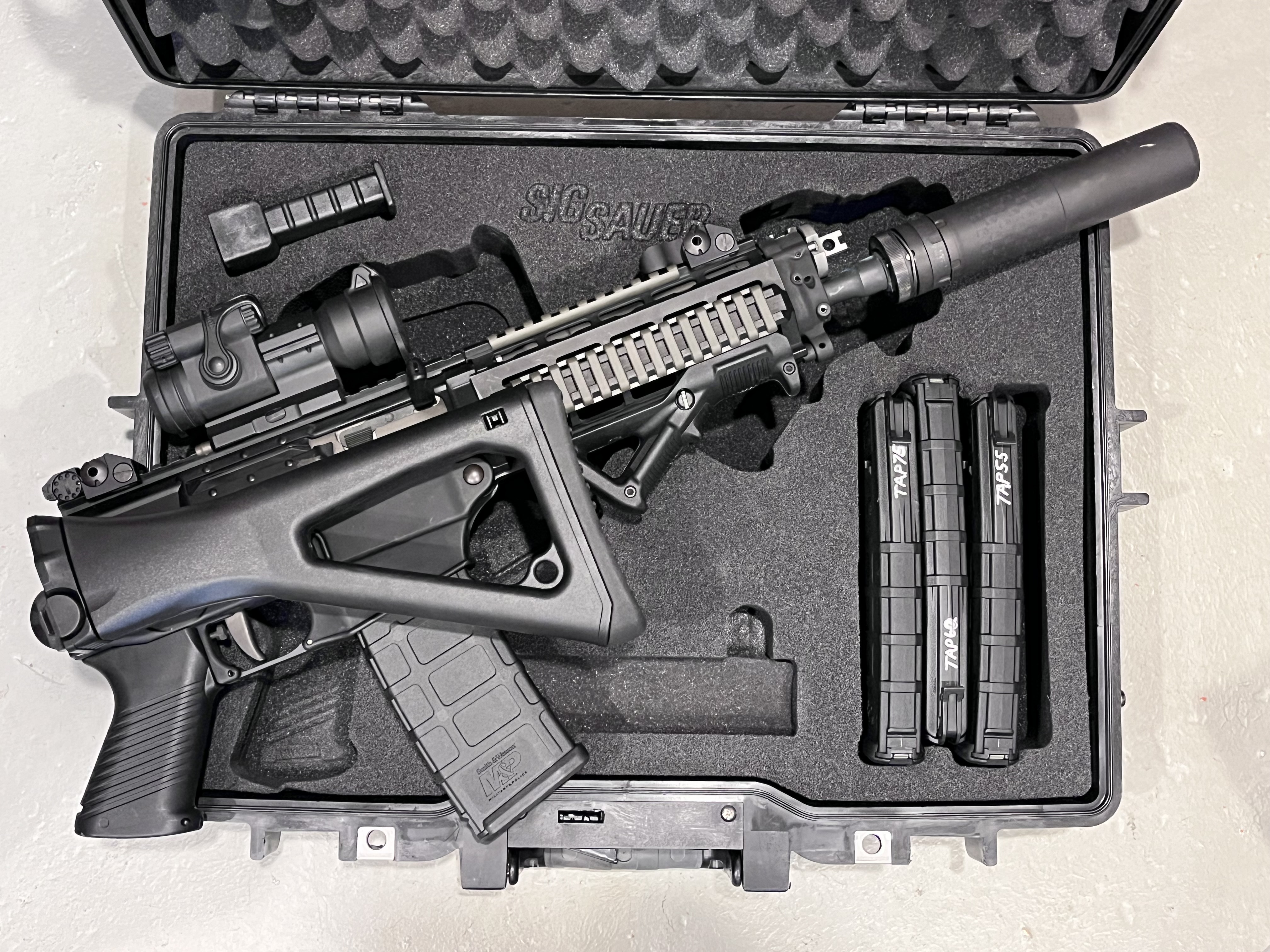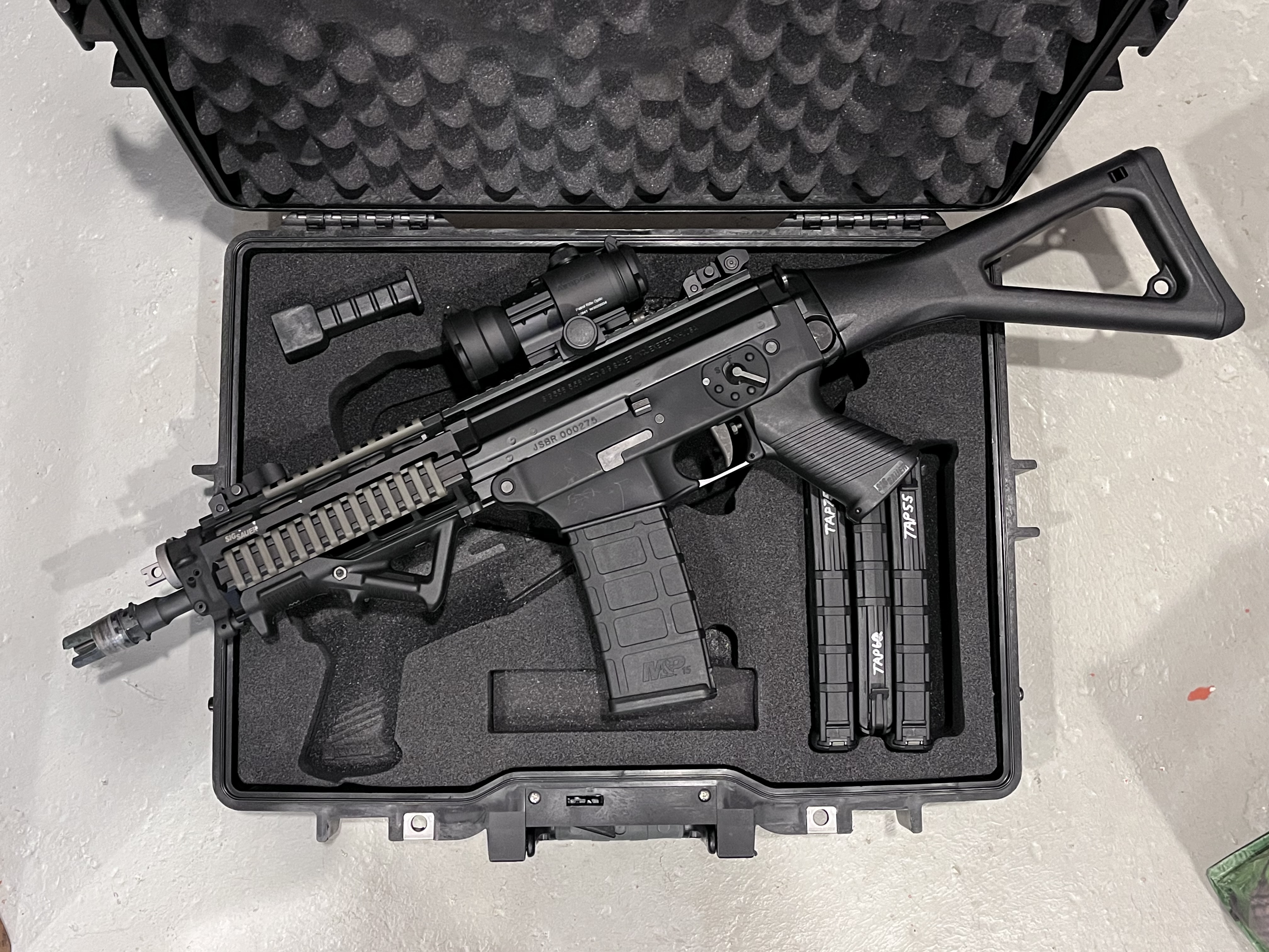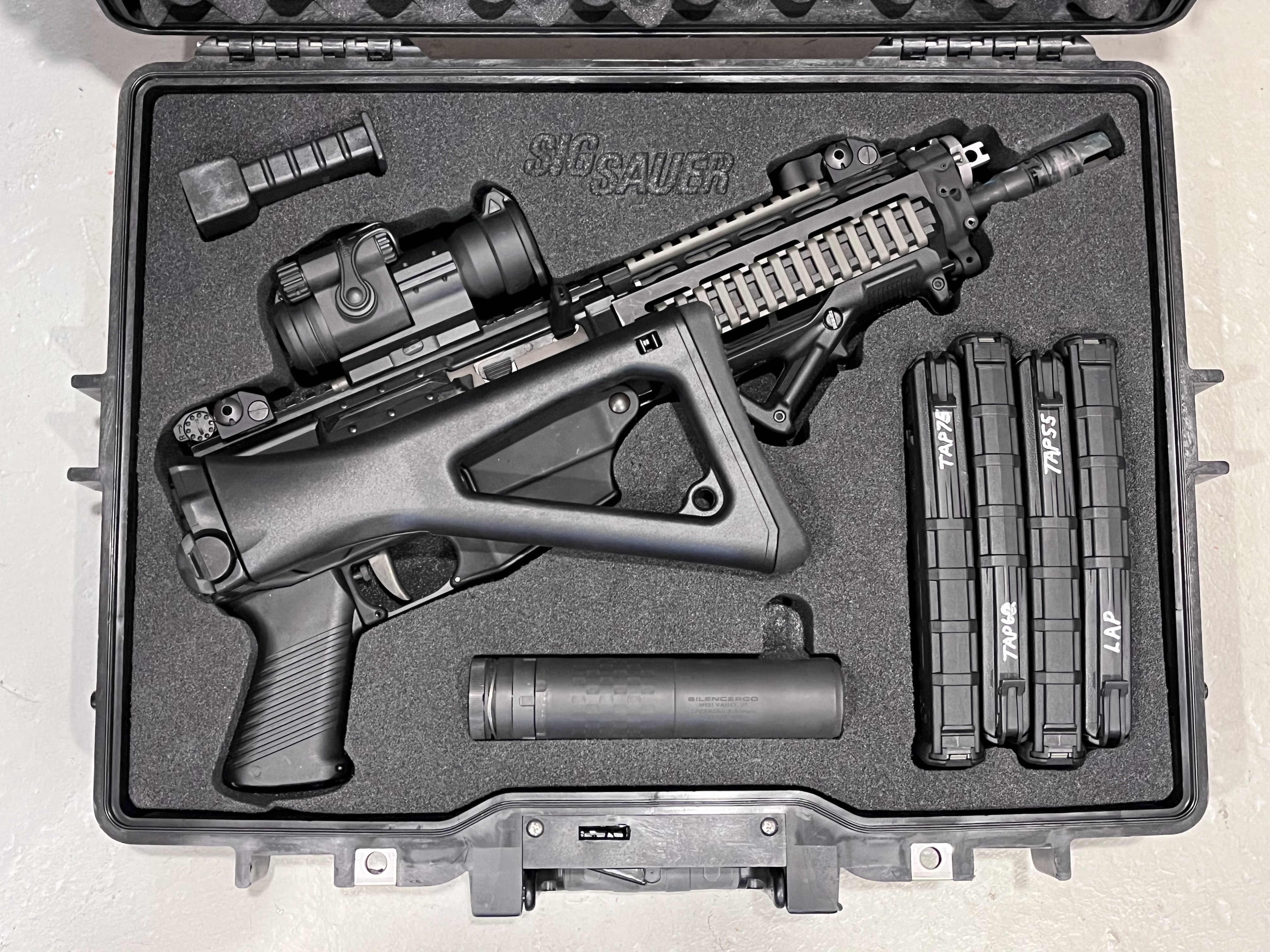 Sig Sauer 556 SBR with Aimpoint PRO red dot sight, folding stock, backup night sights, angled foregrip, and briefcase-size Pelican 1495 locking case with custom foam insert. Very lightly used. The Silencerco Saker 556 suppressor shown in photos is not included. There is NO $200 transfer tax for SBRs as it was abolished on January 1, 2026, so now it can transfer free of charge with ATF Form 4. I may consider partial trades.