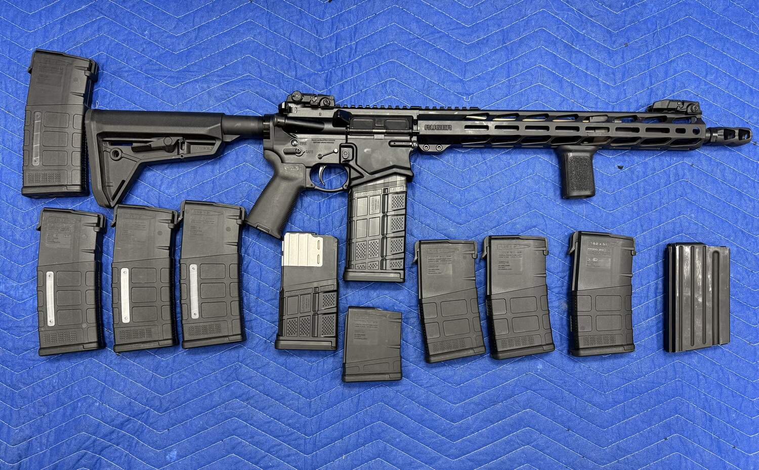 This rifle is a Ruger SFAR( small frame autoloading rifle) in excellent condition. This rifle is chambered in .308 Winchester, they made these rifles in ar-15 size and weight but with that dominant .308 power. This rifles features include kns precision anti walk pins, Magpul MBUS sights, Magpul MOE+ Grip with rubber texture and storage chamber in grip, ambidextrous safety, BCM forgrip, MLOK compatible rail, factory 4 position adjustable gas block, and factory muzzle break. Barrel is hammer forged black nitrade treated. This rifle comes with Twelve mags, five 25 round mags, six 20 round mags and a 10 round mag. Rifle had less than 300 rounds through it and runs great, perfect bear rifle for the summer camp season or the city watch! Rifle is in Palmer area, local face to face deals only. Rifle price is $1100.00, price is pretty firm but priced to move as it comes with enhancements, mags and low round count. I’m the original owner. By responding to this add you an acknowledging that you can legally own firearms and that you are 18 years of age. Cash only for this deal please, no trades. Please call or text if interested, texting preferably.