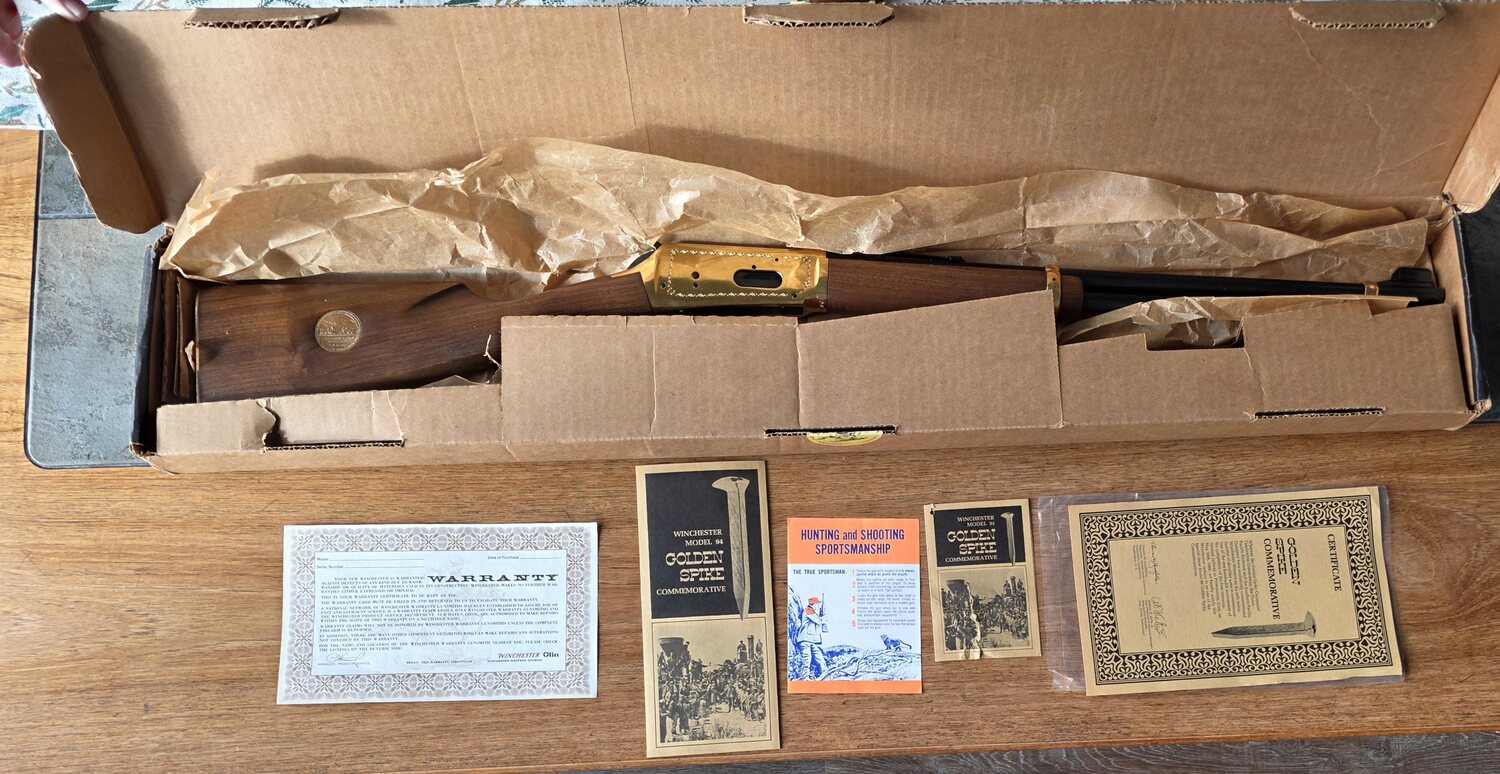 NIB "GOLDEN SPIKE" 30-30 Commemorative never fired collectors rifle with box, sleeve and all paperwork