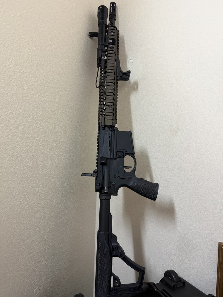 Daniel defense M4A1 with FDE hand guard. It has never been shot, I bought it to have at work but my work no longer allows the use of personal rifles. It comes with 8 Daniel defense M4 mags, a pelican case, a blue force sling, some extra grips, rail covers, the magpul pro flip up sights, surefire turbo flashlight with pressure switch, upgraded giessle flat single stage trigger, and whatever ammo I can find for it.