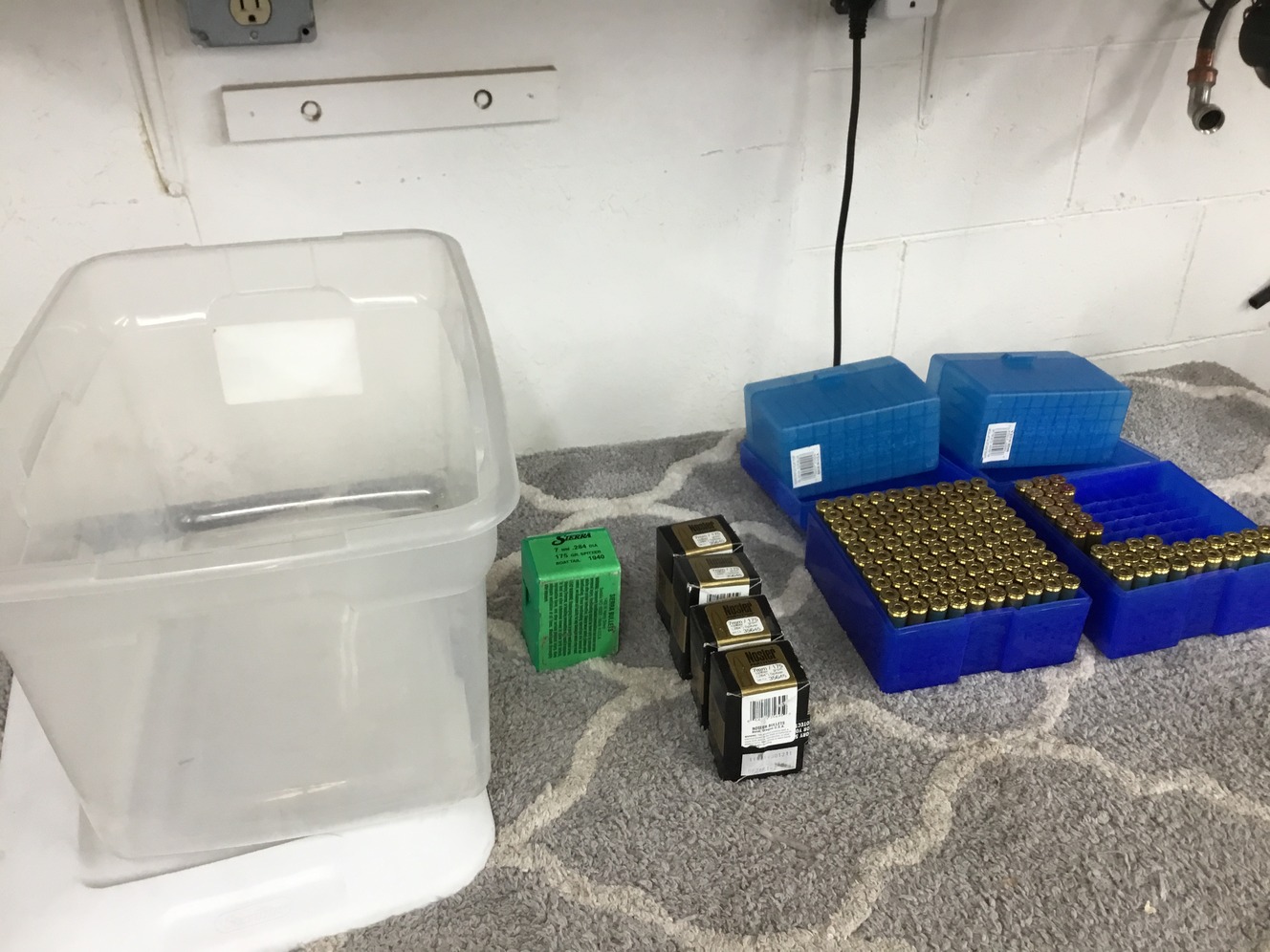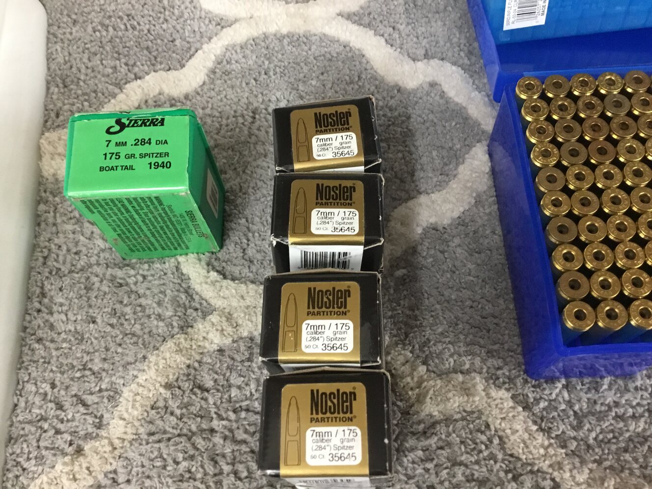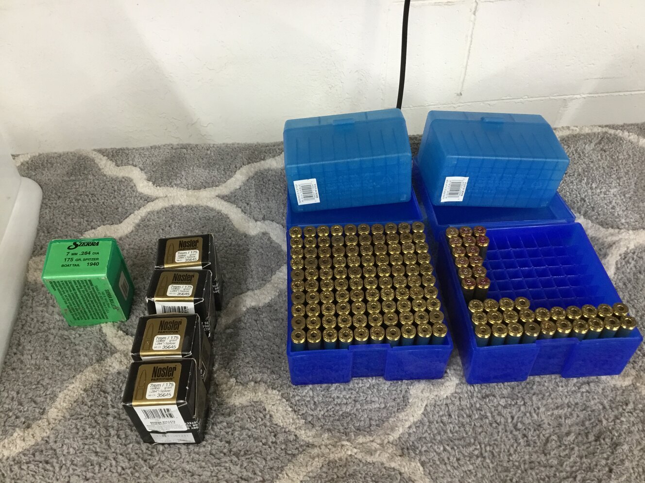 120 new 7mm Remington brass. 20 fired brass. Two 7mm case and bullet holders 100 piece carry. Two 7mm case and bullet holders 50 piece carry. Four 7 mm boxes 175 grain Nozler Partition Bullets. One box Sierra 175 grain boat tail 7mm bullets. All in a small tote. Great savings. Calls Only