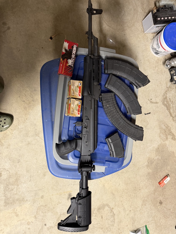 Century arms WASR-10. Replaced the wooden furniture with what’s on it. Folding adjustable stock and picatinny rails. Comes with what’s in the picture 3 boxes of ammo and 4 magazines. Has adjustable iron sights with yard settings that is a lot of fun. $600 OBO