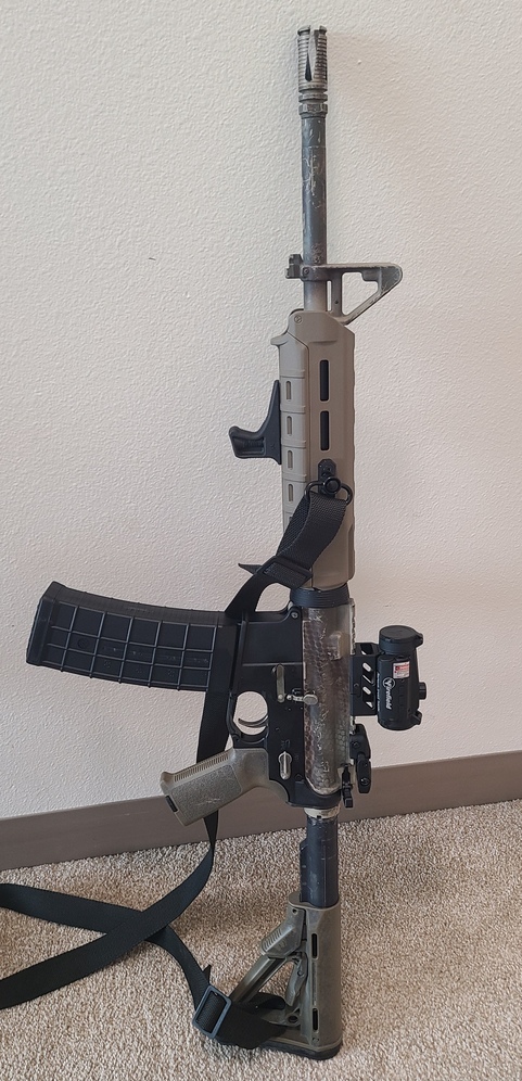 Rock River Arms Midlength HBAR with Front Sight Base and Smith Vortex Flash hider. Breek Arms WARHAMMER charging handle, Ruger folding back up sight, and Firefield Impulse 1x22mm Illuminated Compact Red Dot Sight w/ Red Laser (eotech style illuminated circle/dot). F1 Firearms lower with magpul MOE grip and CTR stock. Comes with 60 round coffin mag, 2 aluminum 30 round mags, and a sling. $550 or best offer. Cash or electronic payment accepted.