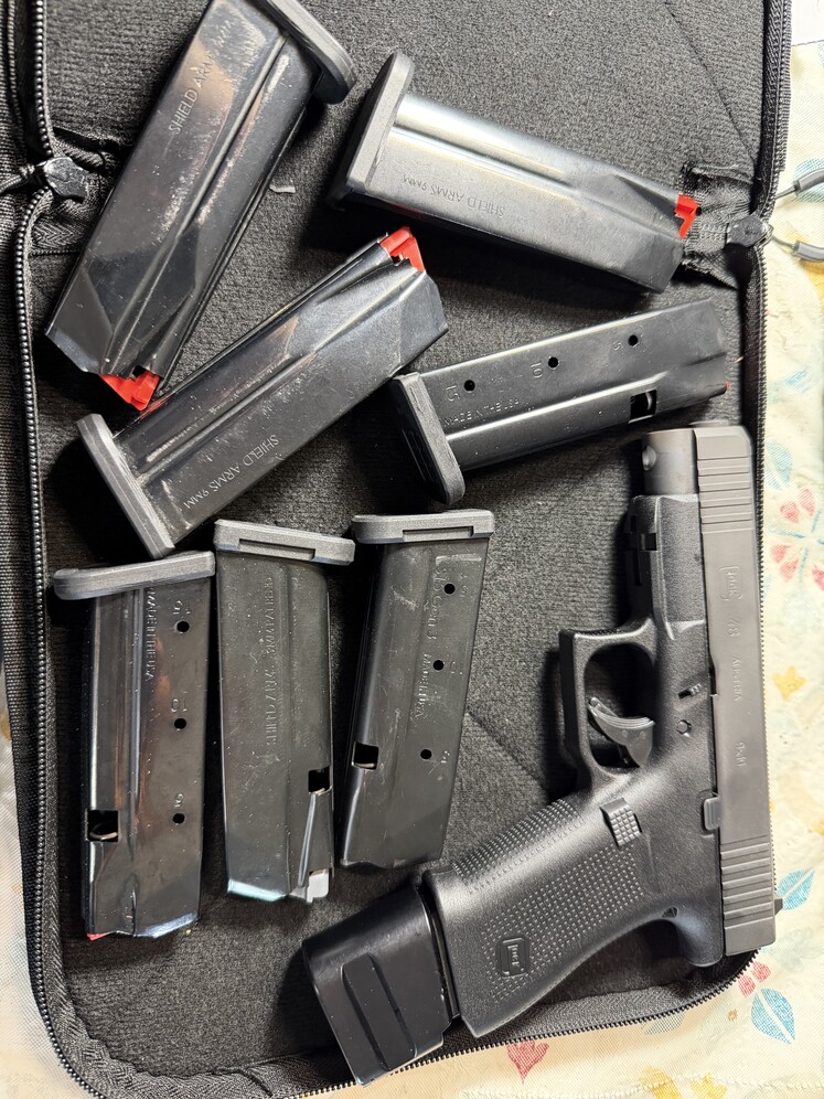 Glock 48 9mm with 7 15 round shield mags and a 20 round shield mag, upgraded mag catch to run metal mags. 2 OEM 10 round mags and OEM mag catch included. $850