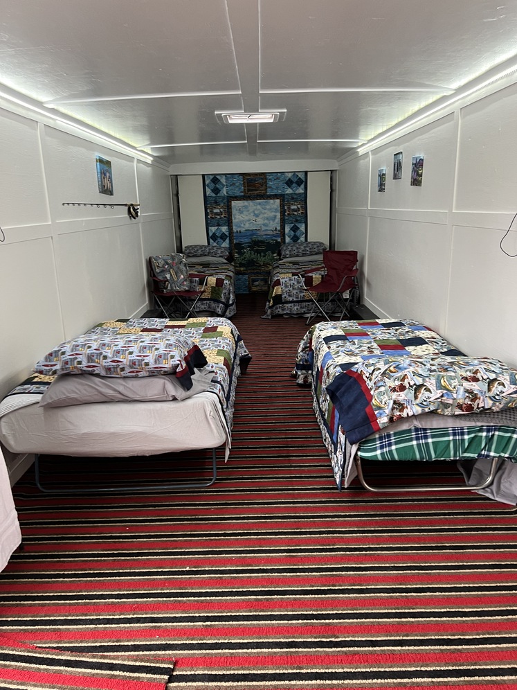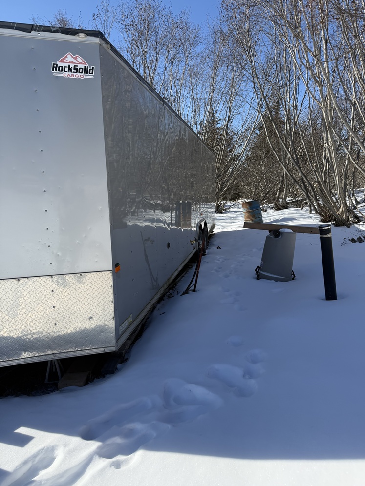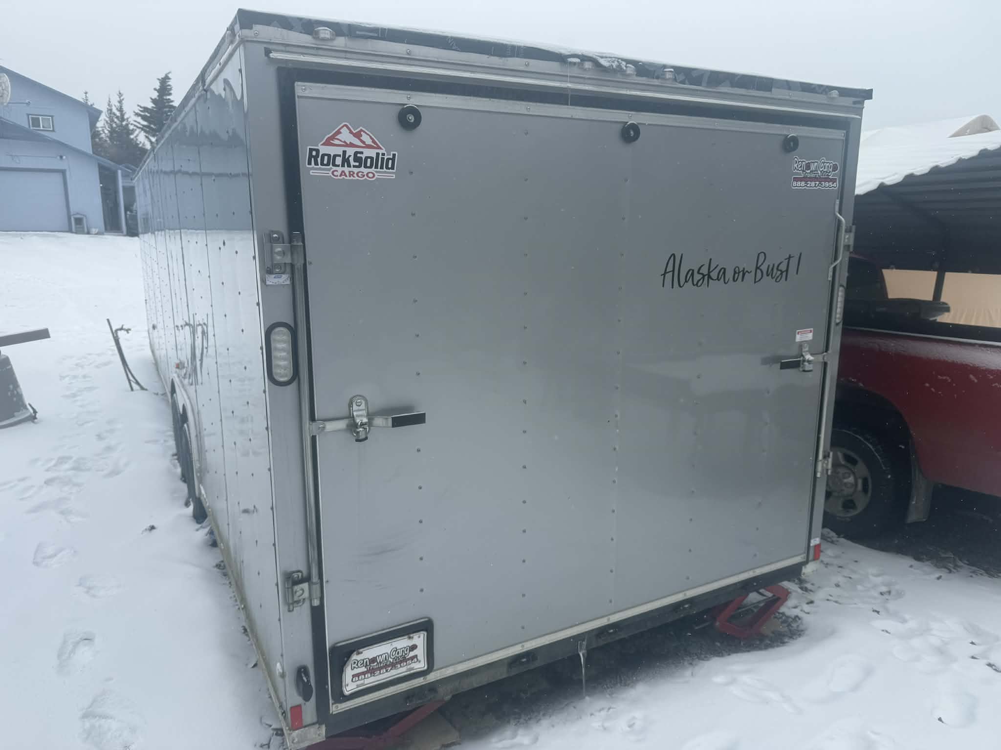 28' enclosed trailer one trip up the Alcan. I bought it and turned it into a bunkhouse for guests has led lighting an electrical outlet on the outside to plug it in. Carpeted and painted. Reinforced ceiling with 1/4" plywood. Door in front and the back drops down with a loading ram. Has a. Ew tire and extra hub. This is a 2019 Rock Solid trailer. Has a Z tag on the license plate. This will haul your toys or just about anything you want to use it for. Asking 20,000 or Best Offer.