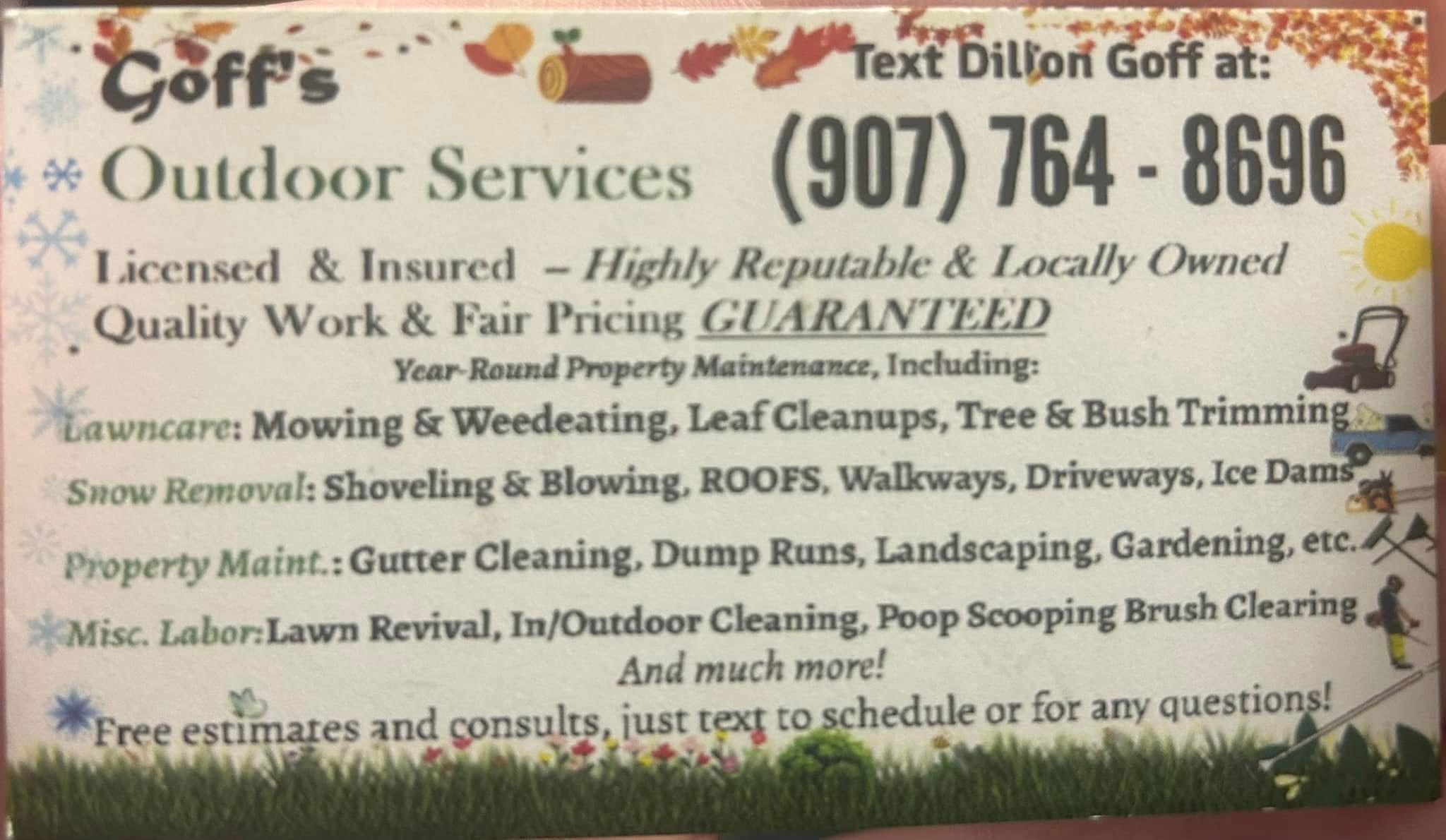 Please text Dillon Goff (text is preferable as we have no receptionist) or leave a voicemail at 907-764-8696 if you have any questions or are interested in scheduling!