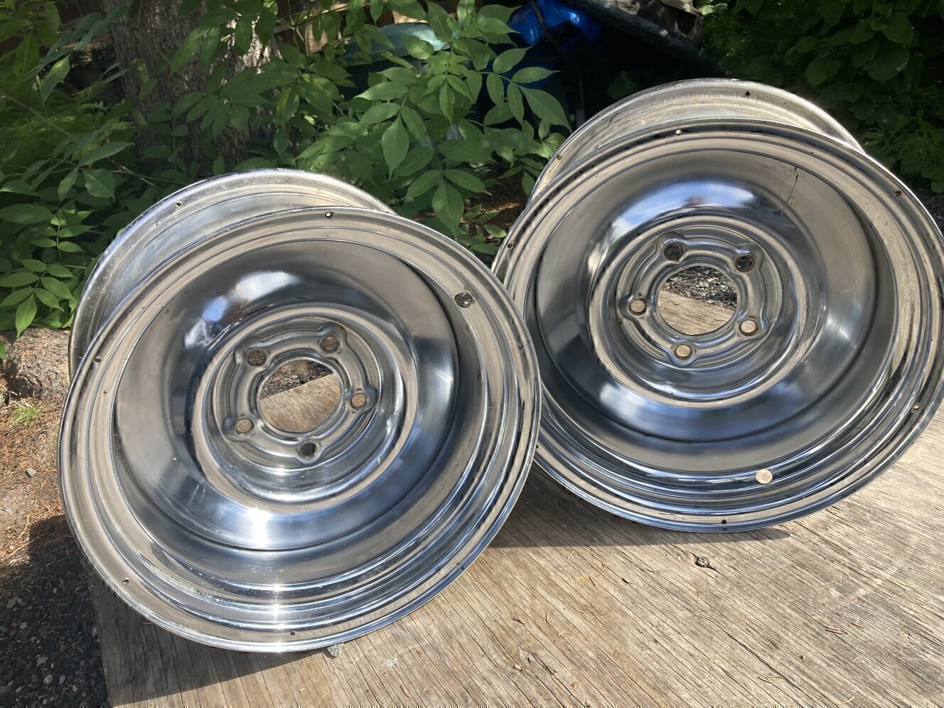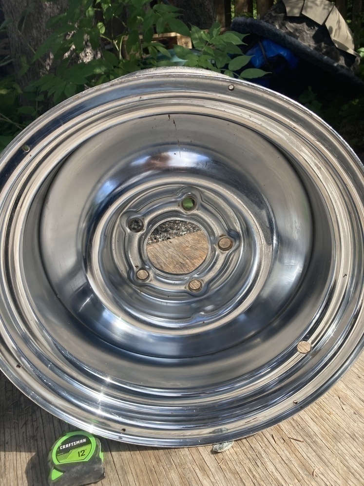 8X15 Chrome Rims Chevy Bolt Pattern . These wheels were from my 1970 Drag Racing Camaro. 5 hole 4 1/2" mounting pattern. Lightly scratched & some pitting (see photos). The small holes in the bead area were for screws to prevent slippage of the Slicks. Those holes should not effect the mounting of Street Type tires. This is a set of two wheels!
