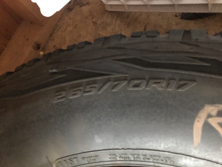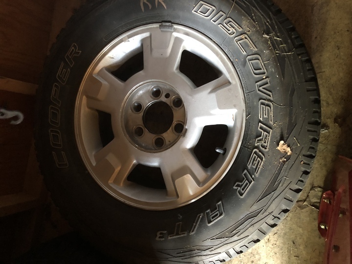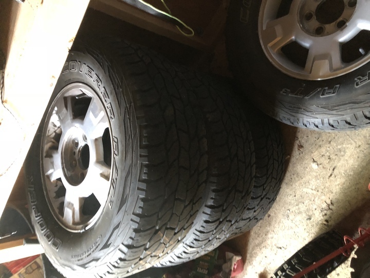 I have a a set of Cooper Discover AT/3 in a 265/70 17 on rims that came off of a 2011 F-150. The tires only have 2 seasons on them, I upgraded tires and rims and no longer need the stock ones. There is still a lot more life left in these tires. I have the center caps and stock lug nuts still that go with these rims. Shoot me a text if interested 907-347-8796