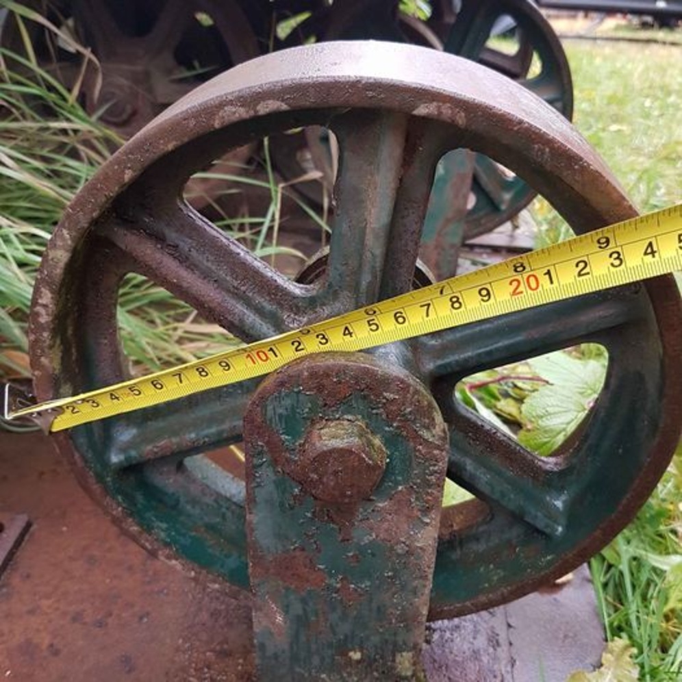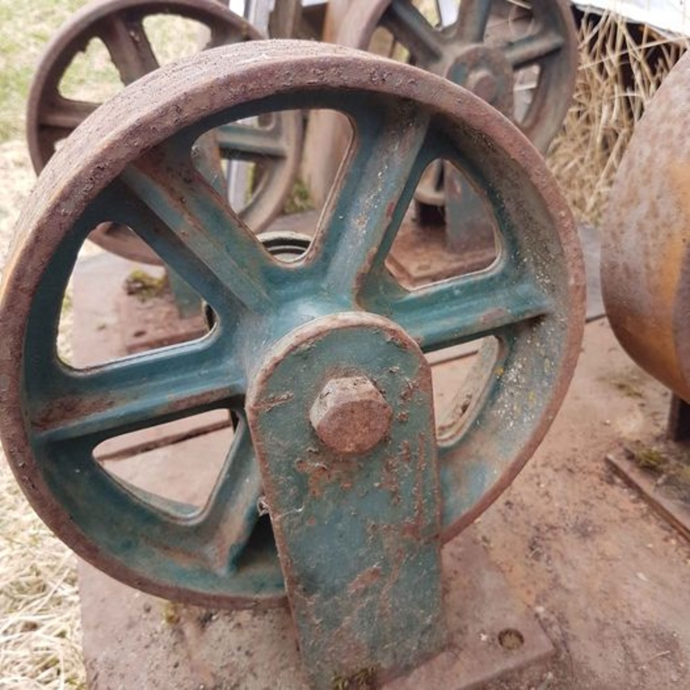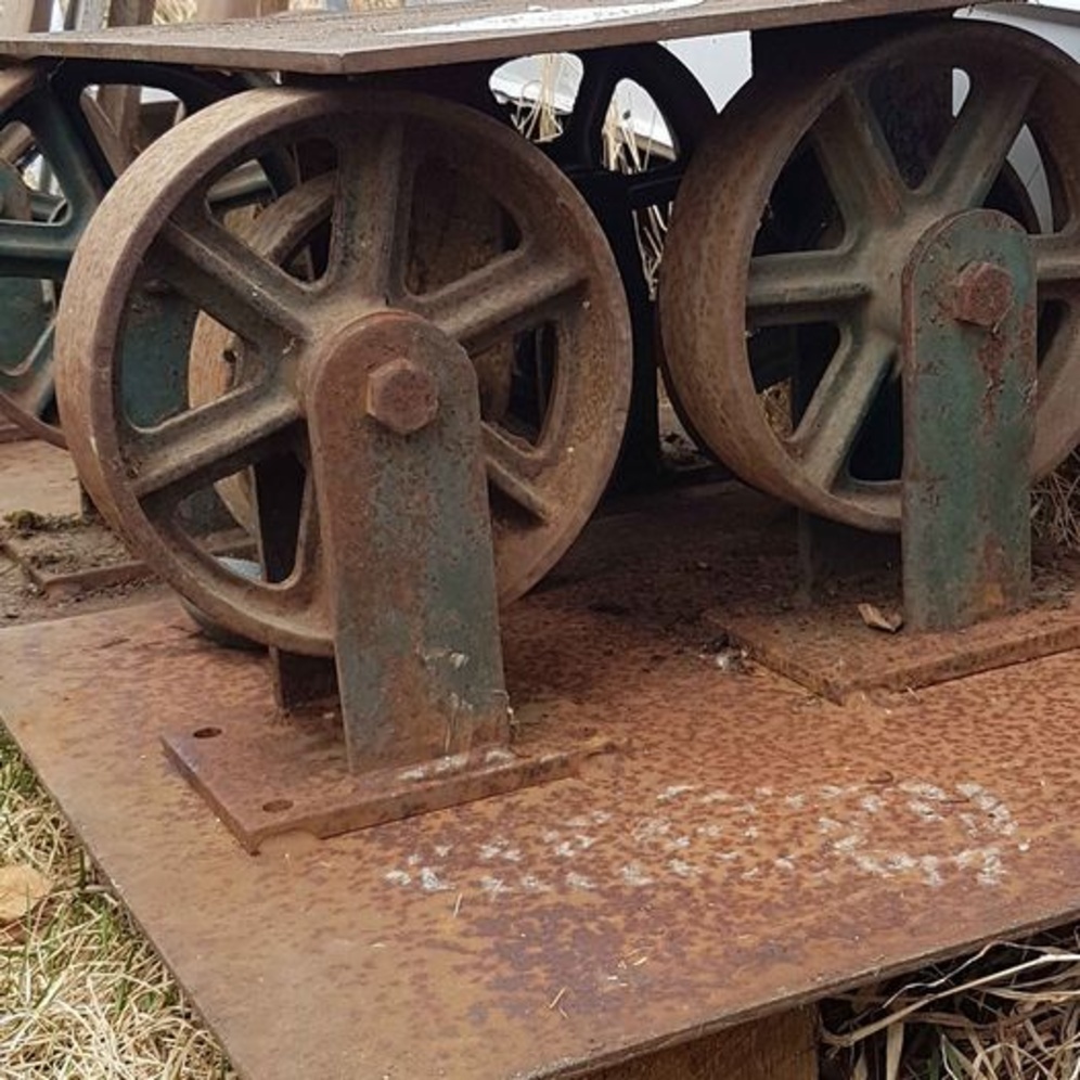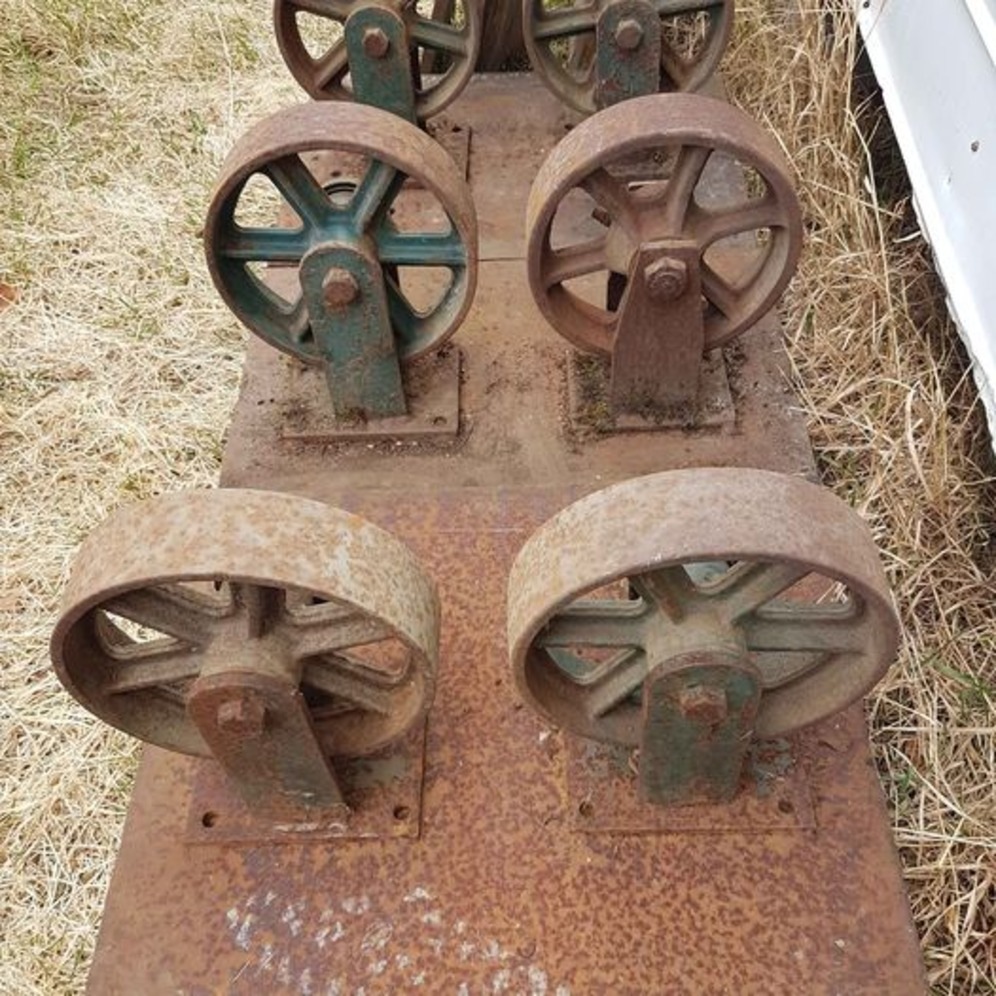 These are something you rarely find and are now for sale as a group. These seriously industrial wheels are in sets of 2 mounted on 1/4 inch metal. 2 of the wheels are mounted on 24 inch squares, the others are 24 inch by 18 inch. Each wheel measure 9.5 almost 10 inches. They were used in a welding operation to transport, move heavy metal, pipe and beams. ( I believe they are Steel or Cast Iron. You can see embossed stamping in pictures.) 8 wheels total (They were possibly designed to hold 10,000 pounds, I don't know that much about them, but someone in the industry suggested that.)I purchased them to repurpose, but they are too cool to do that with...As is, amazing. Each set of 2 weigh about 50 pounds. You will need large truck to move them. AS IS, pictures show detail. Serious questions I can try to answer. Cash sale. Please text first, I'll call when I can